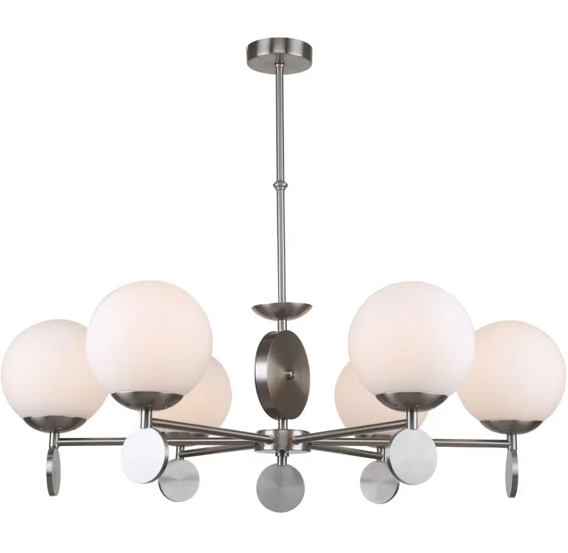 Люстра на штанге из коллекции Marsela выполнена из металла, гальванизированного в цвет никеля, и декорирована белыми стеклянными матовыми плафонами, а также металлическими медальонами, гальванизированными в цвет арматуры. Премиальное качество и неповторимыи? дизаи?н светильников идеально подои?дут в современные и дизайнерские интерьеры.