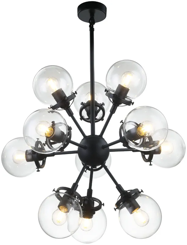 Люстра подвесная из коллекции Ring выполнена из металла, окрашенного в черный цвет, и декорирована стеклянными круглыми плафонами из прозрачного стекла. Премиальное качество и неповторимыи? дизаи?н светильников идеально подои?дут в современные и дизайнерские интерьеры.