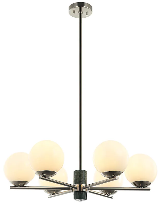 Люстра на штанге из коллекции Sharo выполнена из металла, гальванизированного в цвет никеля, и декорирована натуральным мрамором. Источники света закрыты белыми глянцевыми плафонами. Премиальное качество и неповторимыи? дизаи?н светильников идеально подои?дут как в классические, так и современные дизайнерские интерьеры.