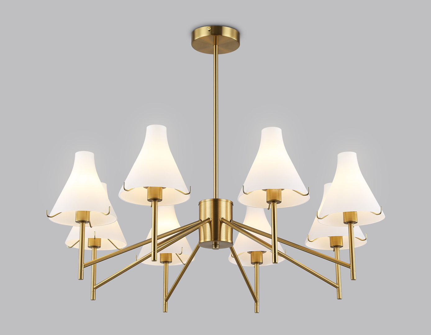 Подвесная люстра из коллекции HIGH LIGHT. Модель LH57135 представлена в стиле неоклассика. Люстра выполнена из металлического каркаса цвета латунь и стеклянных матовых плафонов. Для данной модели подойдут лампы с цоколем Е14. Люстра будет прекрасным дополнением в любом помещении.