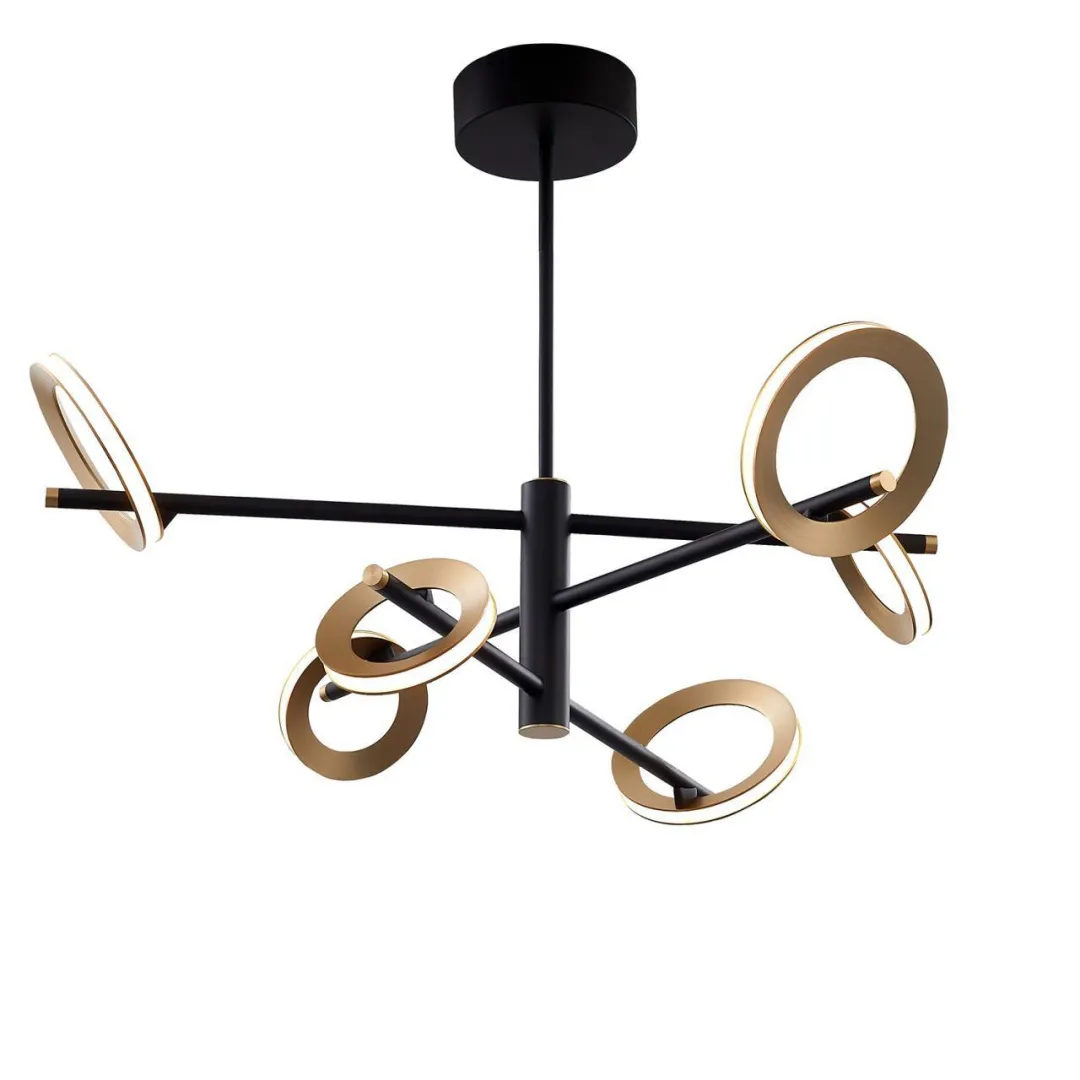 Металлический каркас черного цвета, объемные кольца цвета матовое золото, закреплены под разным углом к каркасу светильника, светятся по периметру благодаря встроенной ленте LED, регулируемая высота.