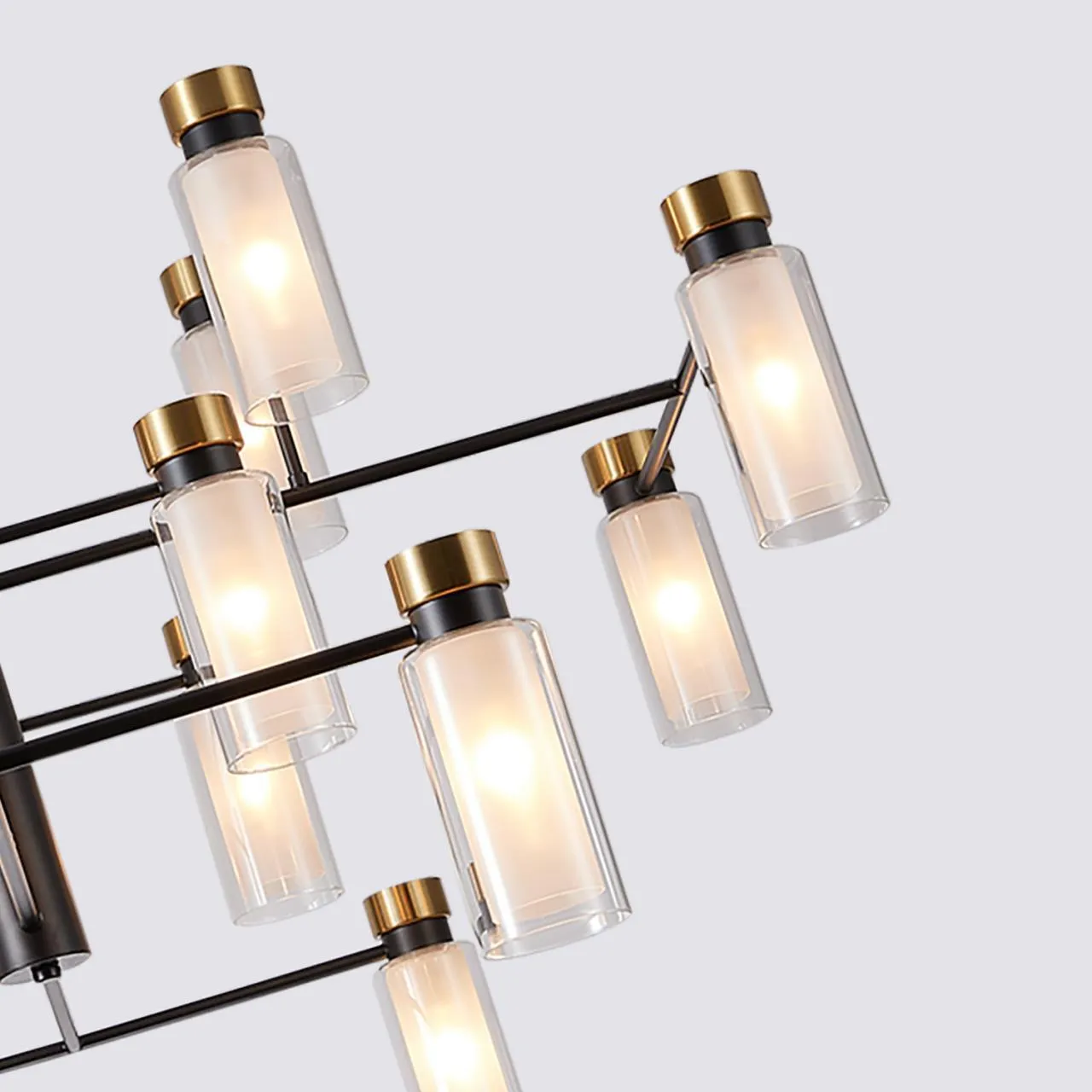 Металлический каркас черного матового цвета, цилиндрические плафоны, состоящие из двух слоев: внутренний из белого матового стекла, внешний  из прозрачного стекла, декоративные элементы в цвете латунь, цоколь E14.
