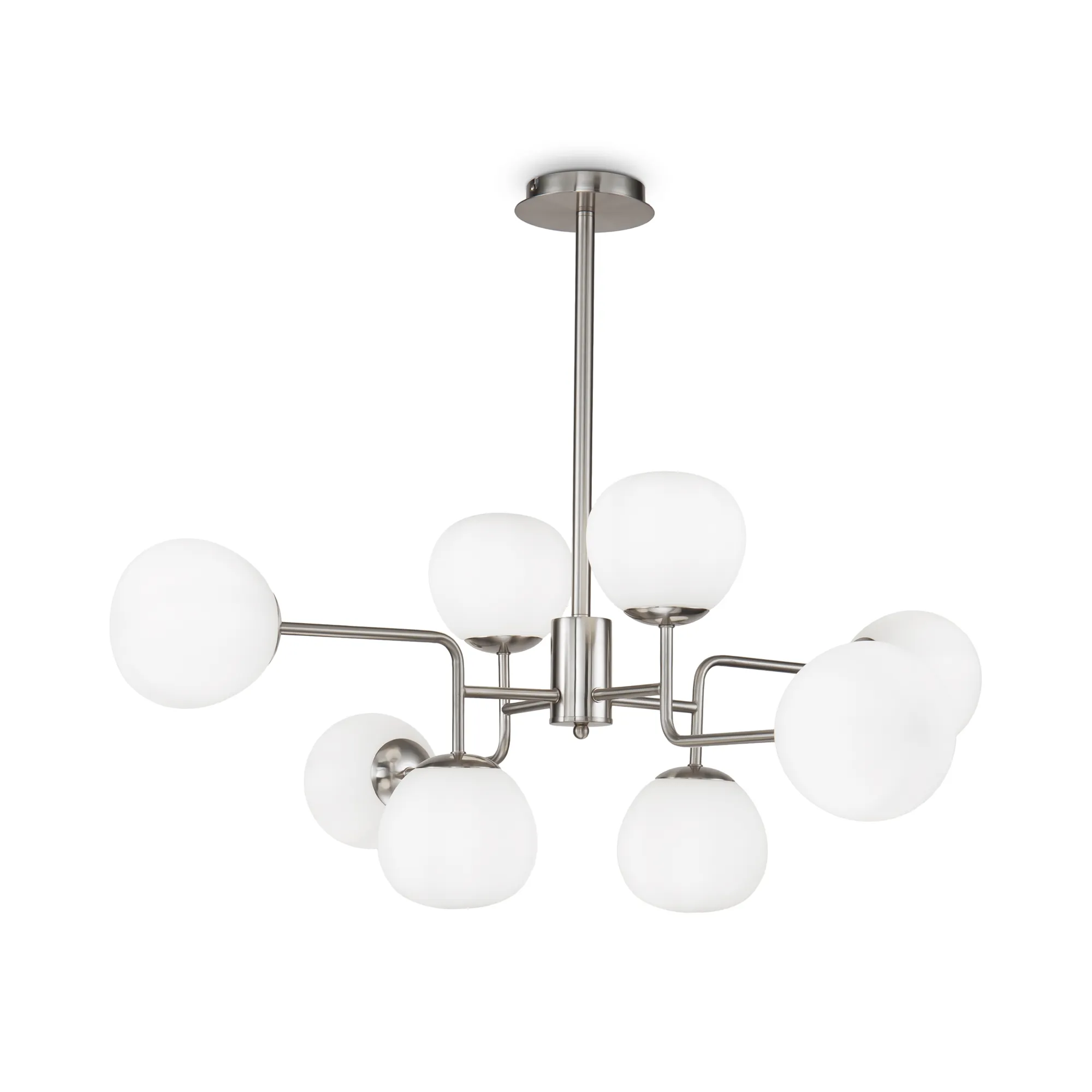Белые плафоны из выдувного стекла похожи на жемчужины в обрамлении  латунного или никелированного цвета металла. Серия представлена разными по размеру и применению моделями. Светильники можно использовать для общего и локального освещения, их конструкция максимально функциональна. У торшера и настольной лампы можно изменять положение плафона. Высота подвесных светильников регулируется длиной троса. У люстр центральная штанга состоит из трех частей, благодаря чему можно изменять высоту светильника. Дополнением коллекции являются потолочные светильники, которые максимально расширяют возможности использования свктильников серии в помещениях с различными переметрами.
