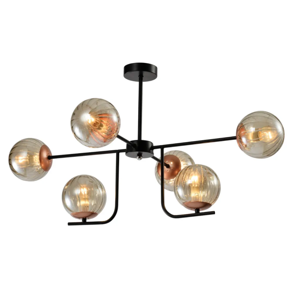 Мягкое теплое тонирование круглых плафонов люстры Desma помогает создать в комнате уютную расслабляющую атмосферу. Пять ламп Е14 мощностью 40 Вт равномерно осветят площадь от 15 м². Эта модная люстра на потолок совместима как с обычными, так и со светодиодными лампочками.