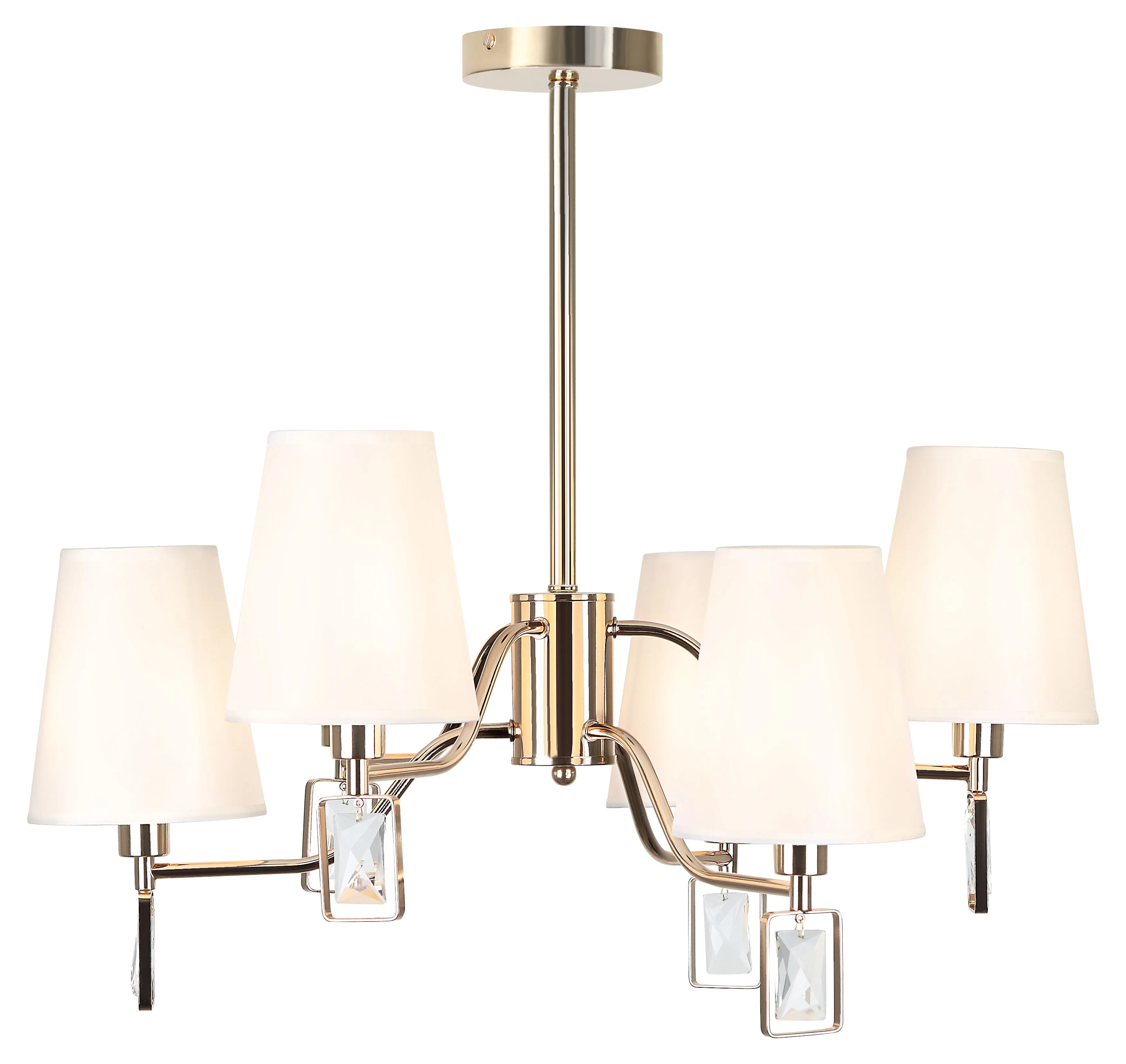 Классическая потолочная люстра Rivoli Cristal (арт. 2095-306) декорирована хрустальными геометричными подвесками. 6-рожковая люстра — прекрасное решение для организации освещения в гостиной. Каждый плафон украшен миниатюрным тканевым абажуром. Цвет арматуры — золото, цвет плафонов — белый. Диаметр этой большой эффектной люстры — 640 мм. Люстры потолочные на штанге — актуальный тренд дизайна интерьеров. Люстра Rivoli Cristal под 5 ламп Е14 40 Вт равномерно освещает комнату площадью до 18 м2. Коллекцию дополняет 8-рожковая люстра (арт. 2095-308) для освещения помещений большей площади и настенный светильник-бра (арт. 2095-401) для прикроватного освещения. Люстры Cristal итальянского бренда Rivoli стоит купить для спальни, гостиной, загородного дома. Эта дизайнерская коллекция также хорошо подходит для пространств сегмента HoReCa — гостиниц, загородных отелей, ресторанов
