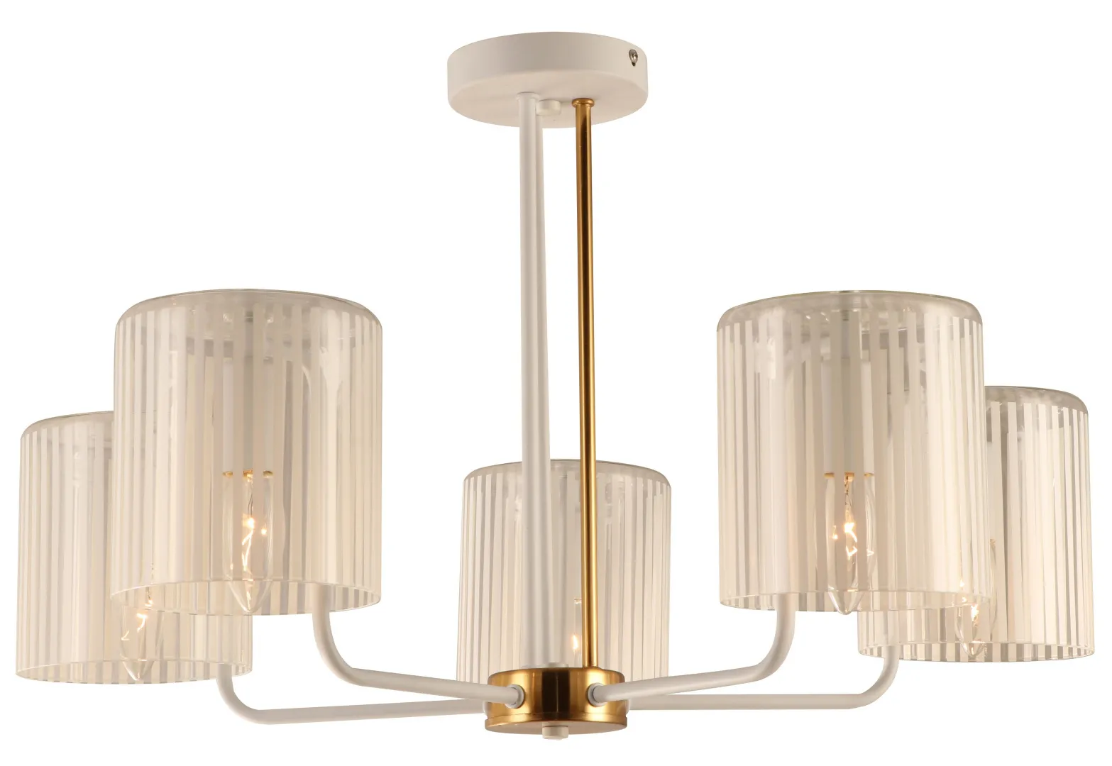 5-рожковая люстра на двух штангах – белого и золотого цветов. Плафоны люстры на потолок Rivoli Evonne (арт. 2088-305) изготовлены из стекла с чередованием прозрачных и матовых участков. Дизайнерскую коллекцию Evonne в классическом стиле дополняют люстры 7-рожковые (арт. 2088-307) и настенное бра (арт. 2088-401).
