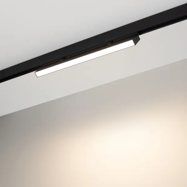 Светильник поворотный для магнитных треков шириной 25мм, 12Вт. Цвет свечения ТЕПЛЫЙ 3000K, световой поток 720лм, угол 100°, CRI>90. Корпус прямоугольный, металл, цвет черный, IP20. Размеры LxWxH 404x20x46мм. Входное напряжение DC24V, мощность 12Вт. Драйвер DС24V/AC230V поставляется отдельно. Диммируется только с 026407, 027633.
