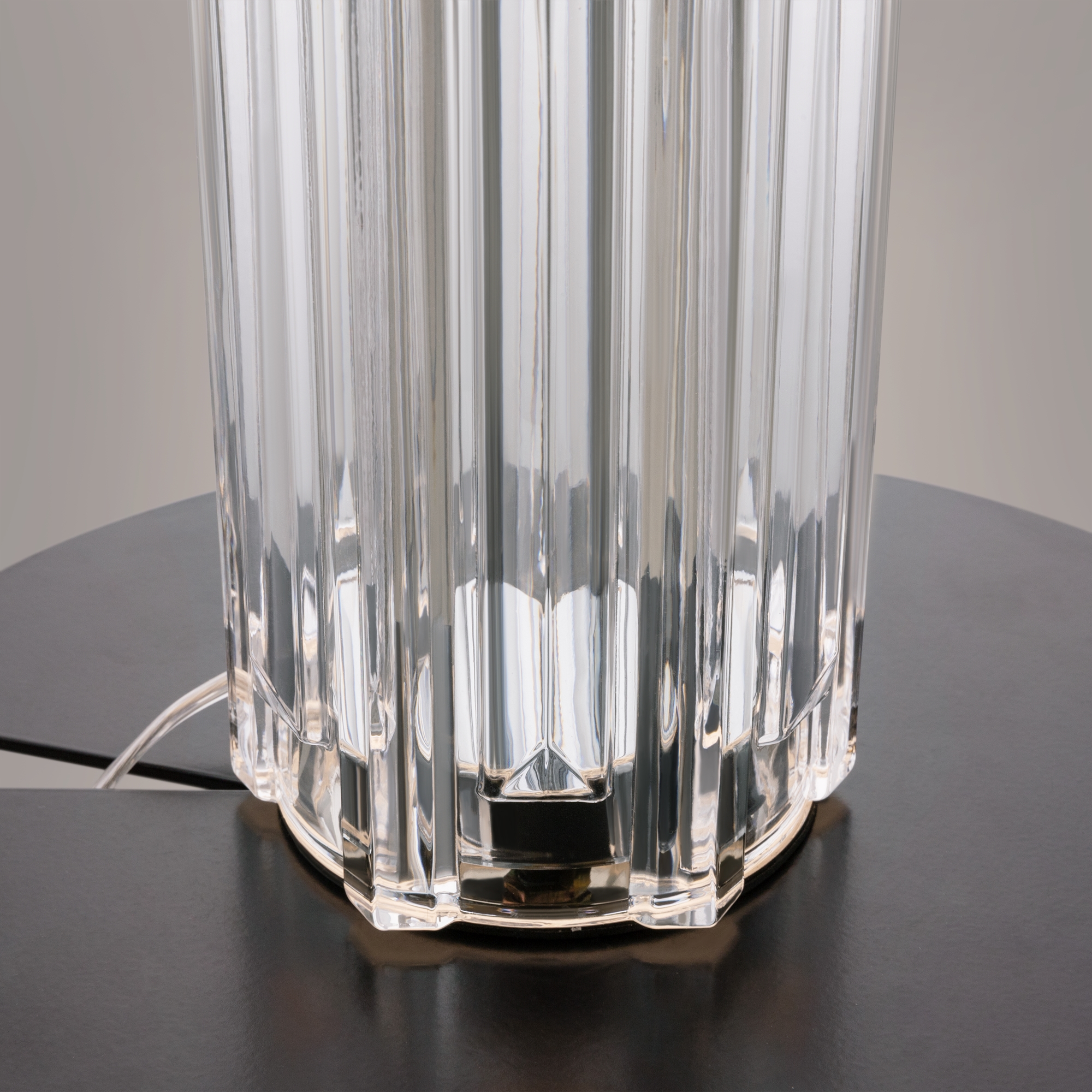 Металлическое основание - дополнено скульптурным литым стеклом в трех оттенках: прозрачном, дымчатом и пудрово-розовом. Хлопковый абажур белого цвета. Цоколь Е27.