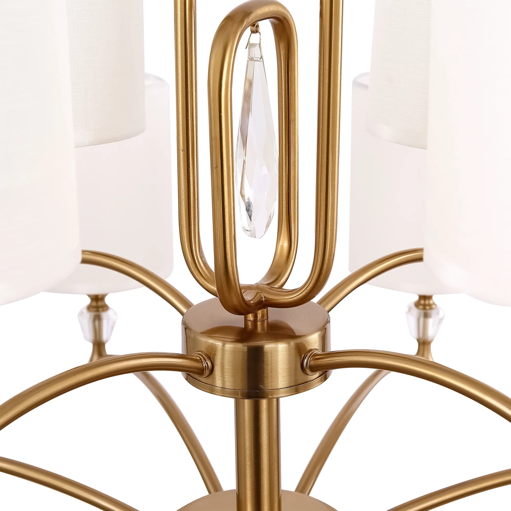 Материал арматуры – нержавеющая сталь, цвет – хром. Материал абажуров – текстиль на ПВХ, цвет – белый. Декор – прозрачное стекло. Акцентные стеклянные кристаллы на рожках со сложной огранкой.