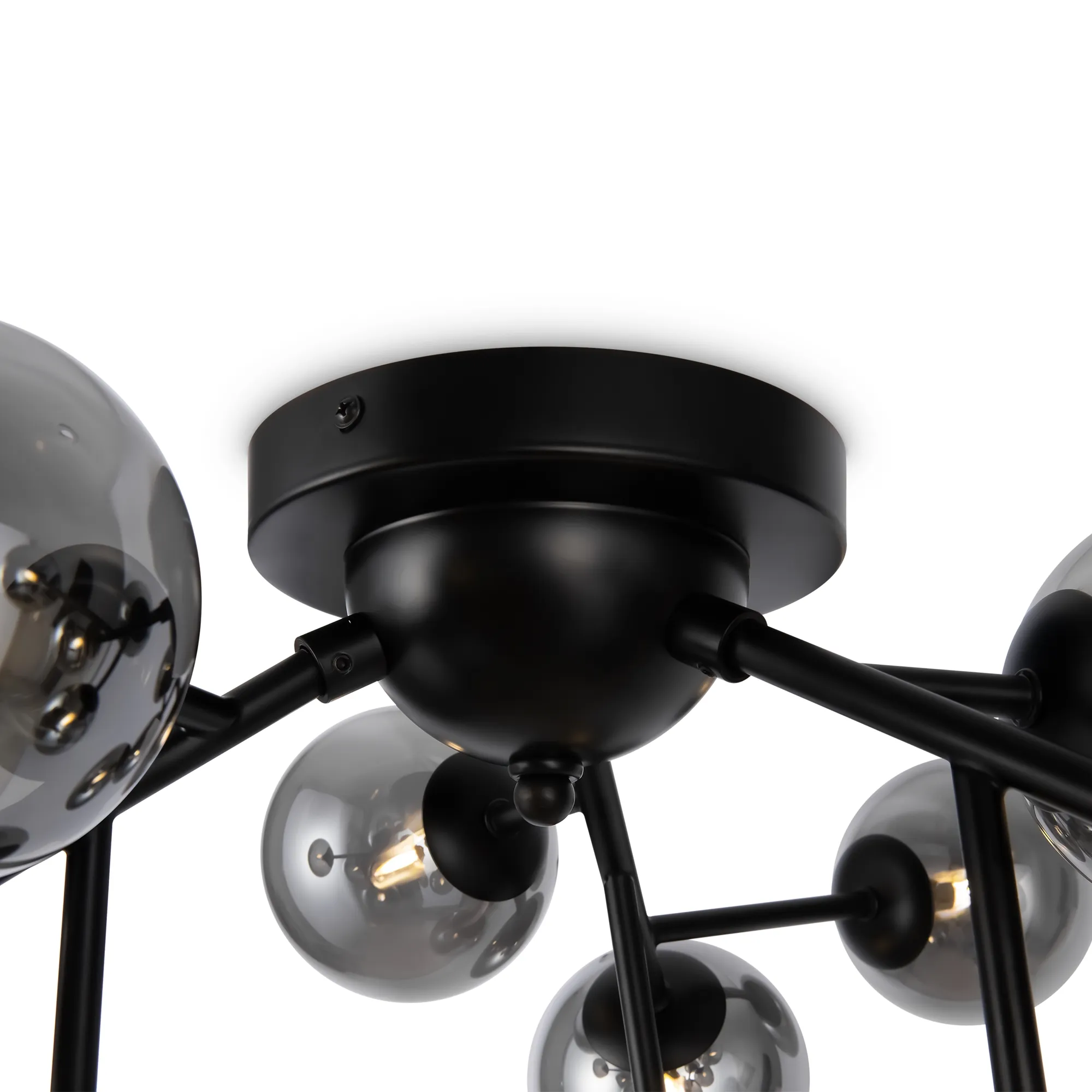 Металлическая арматура в четырех цветах: матовый черный, хром, золото, латунь. Плафоны — выдувное стекло. Цвета — дымчатый, янтарный, коньячный. Дизайн с имитацией молекулярной структуры. Высота подвесных светильников регулируется тросом. Лампа с цоколем G9.