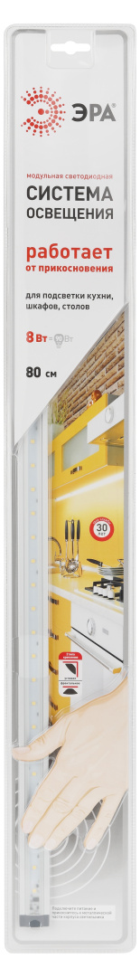 Светодиодный модуль с управлением от датчика прикосновения с возможностью шаговой регулировки яркости (6%, 50%, 100%). Мощность 8Вт. Срок службы 30000 часов. Напряжение питания 12В DC. Цветовая температура 4000K. Комплектация: светильник, источник питания, крепежные клипсы, двусторонний скотч.