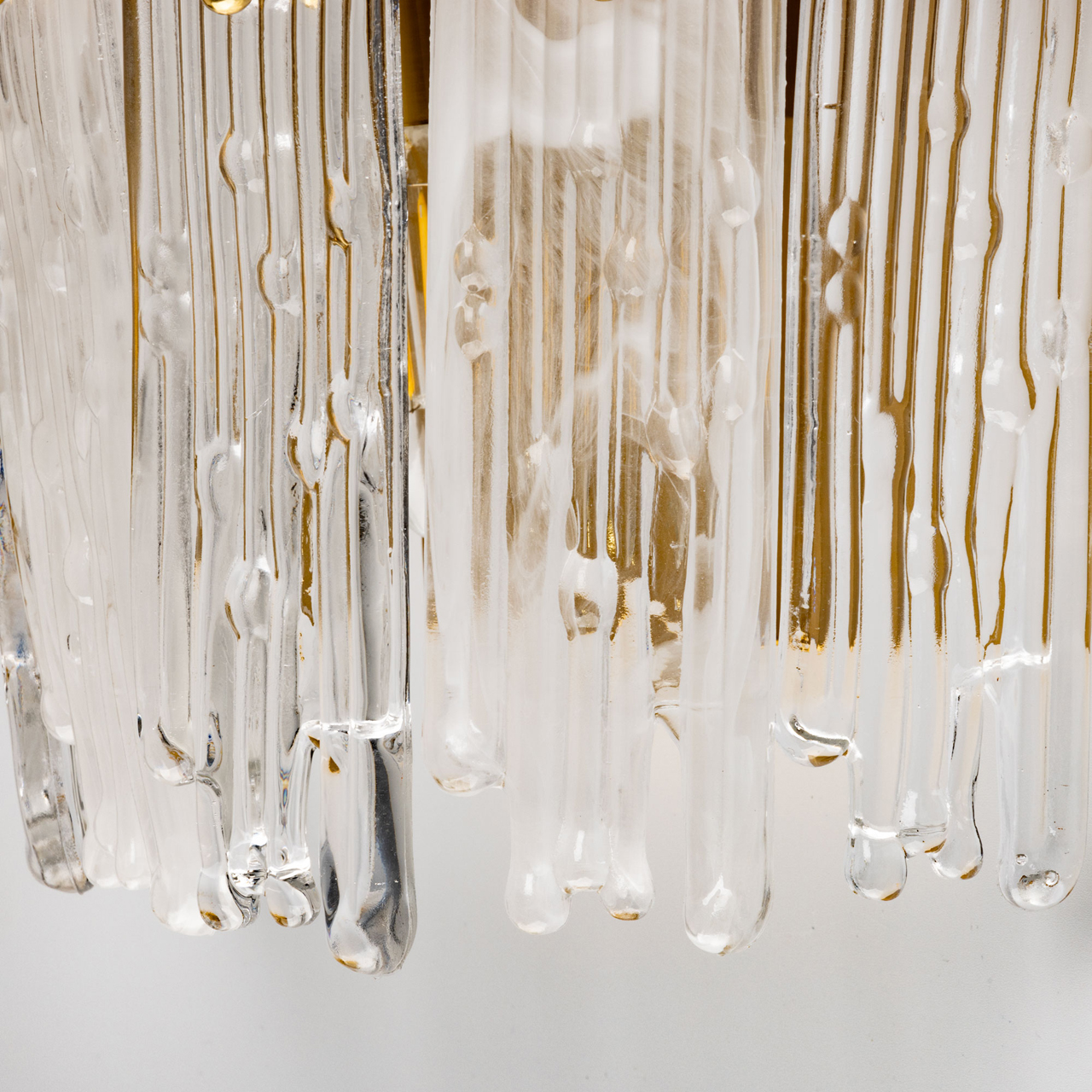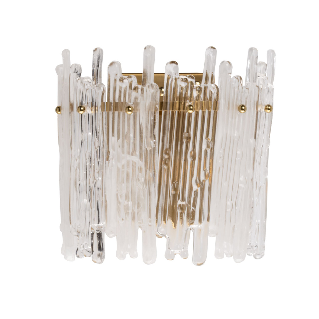 Металлическое основание настенного бра гальванизировано в цвет латуни. Настенное бра декорировано пластинами оригинальной формы из прозрачного и белого стекла.