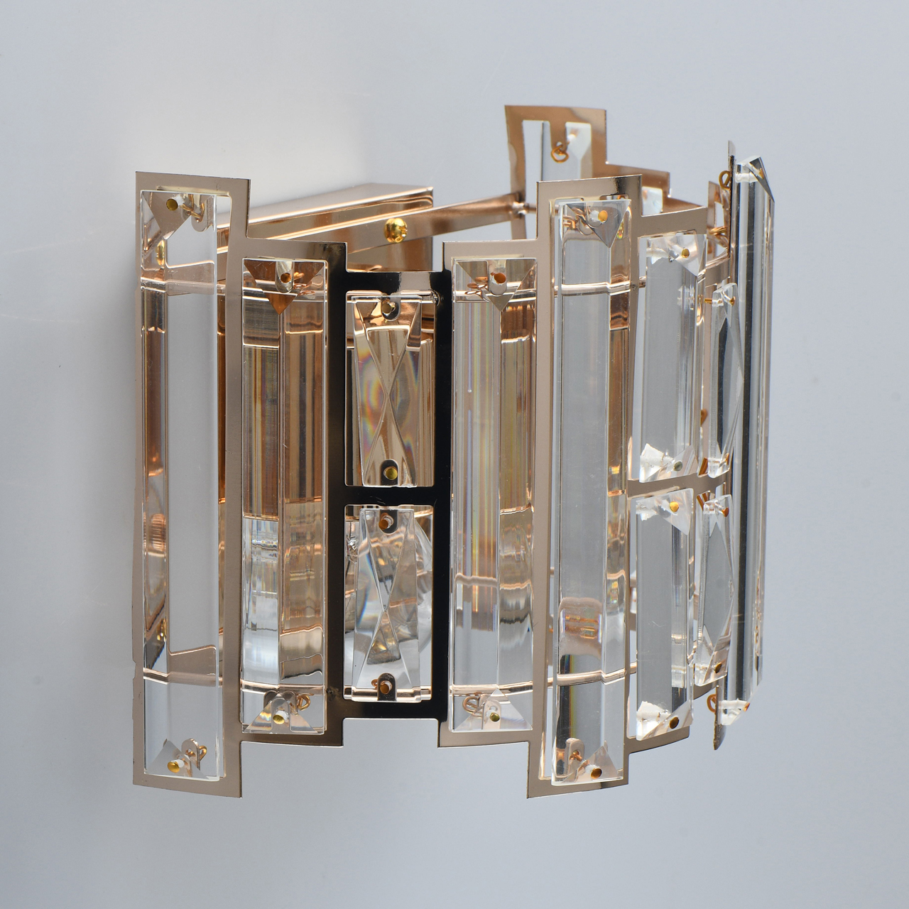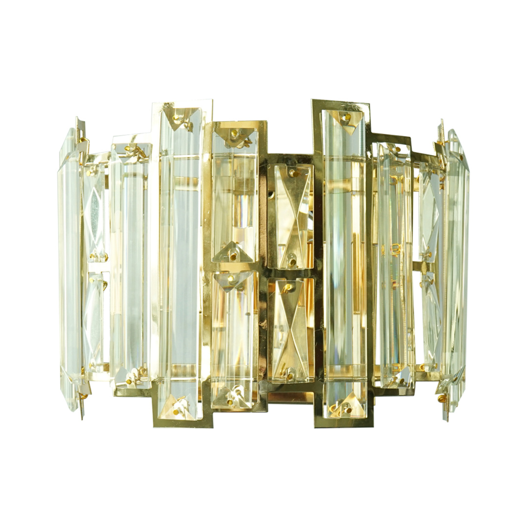 Основание светильника выполнено из металла и гальванизировано в цвет французского золота. Плафоны светильника вырезаны по технологии лазерной резки. Светильник декорирован прозрачным хрусталем прямоугольной формы.