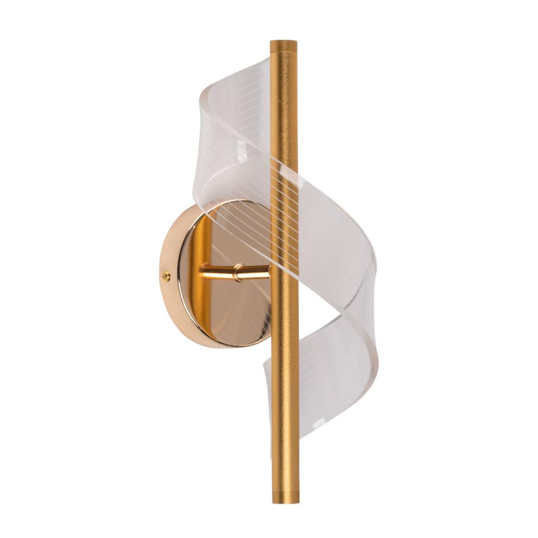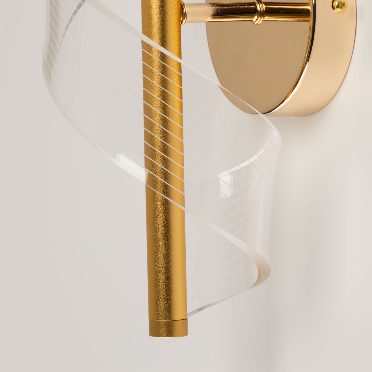 Металлическое основание настенного бра гальванизировано в цвет золота. Корпус плафона выполнен из сплава алюминия и окрашен в цвет золота. Плафон декорирован прозрачным акрилом с линейным рисунком.