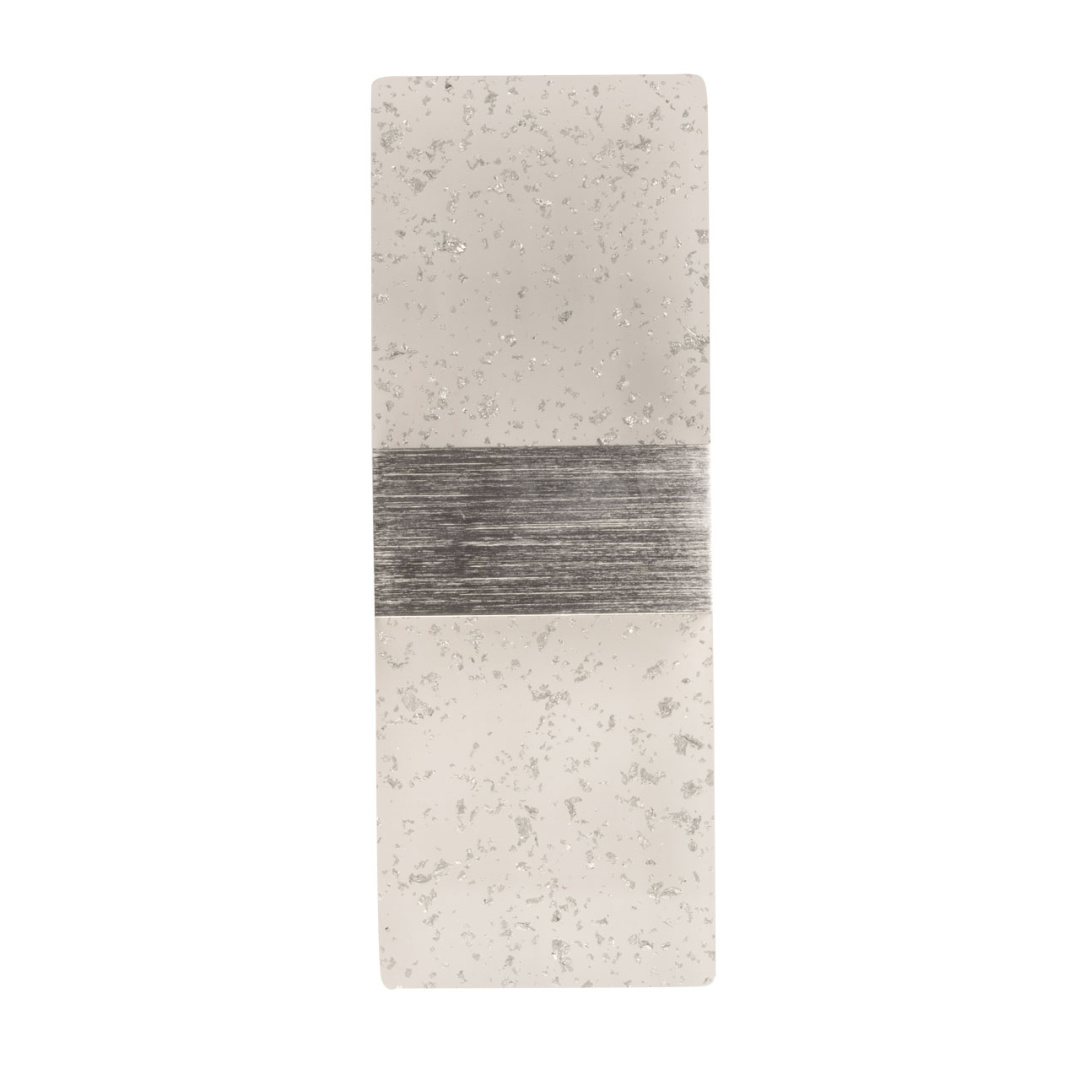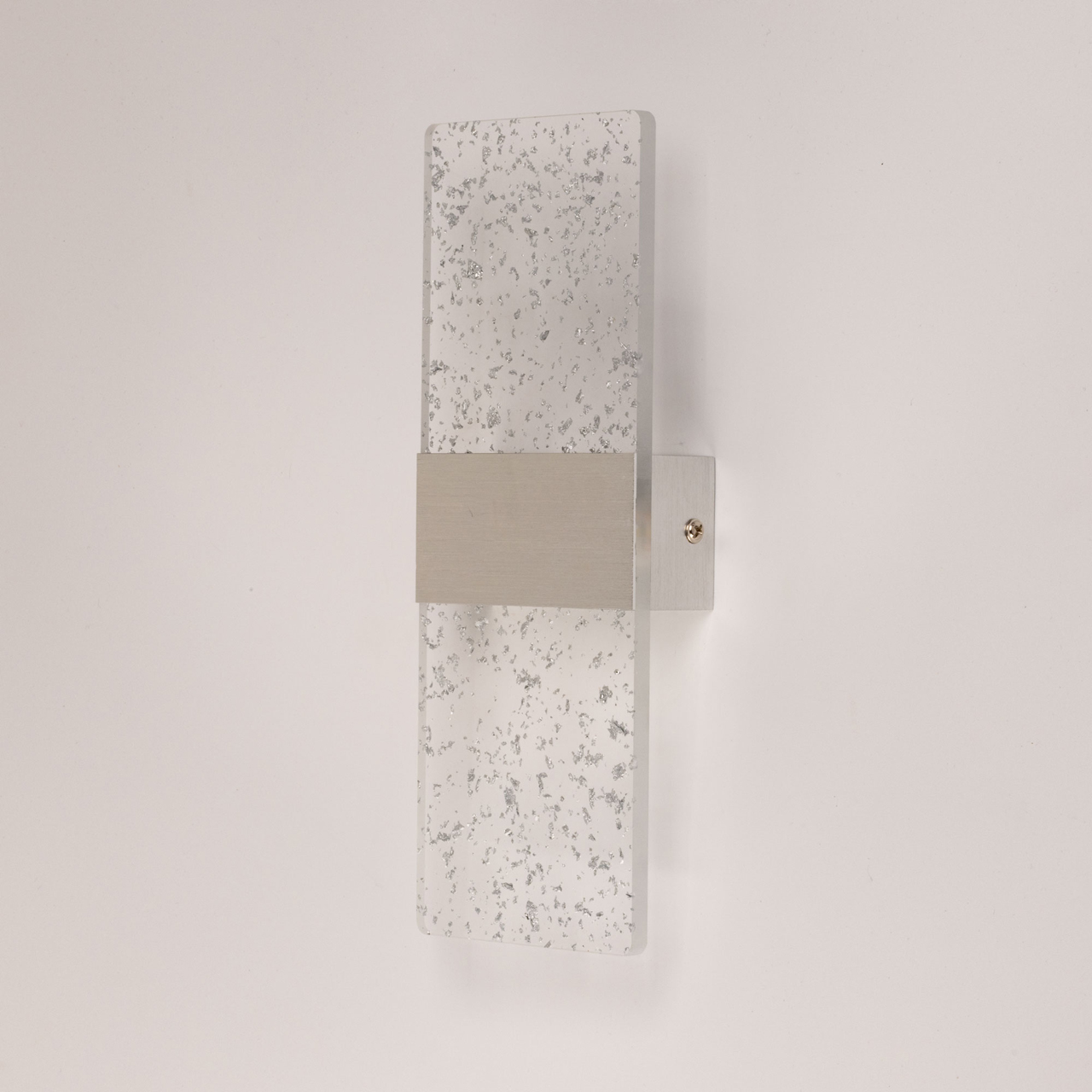 Металлическое основание настенного бра окрашено в цвет серебра. Корпус плафона выполнен из сплава алюминия с цинком, обработан по технологии брашинг и оксидирован. Настенное бра декорировано полупрозрачным акриловым плафоном с вкраплениями серебряного цвета.