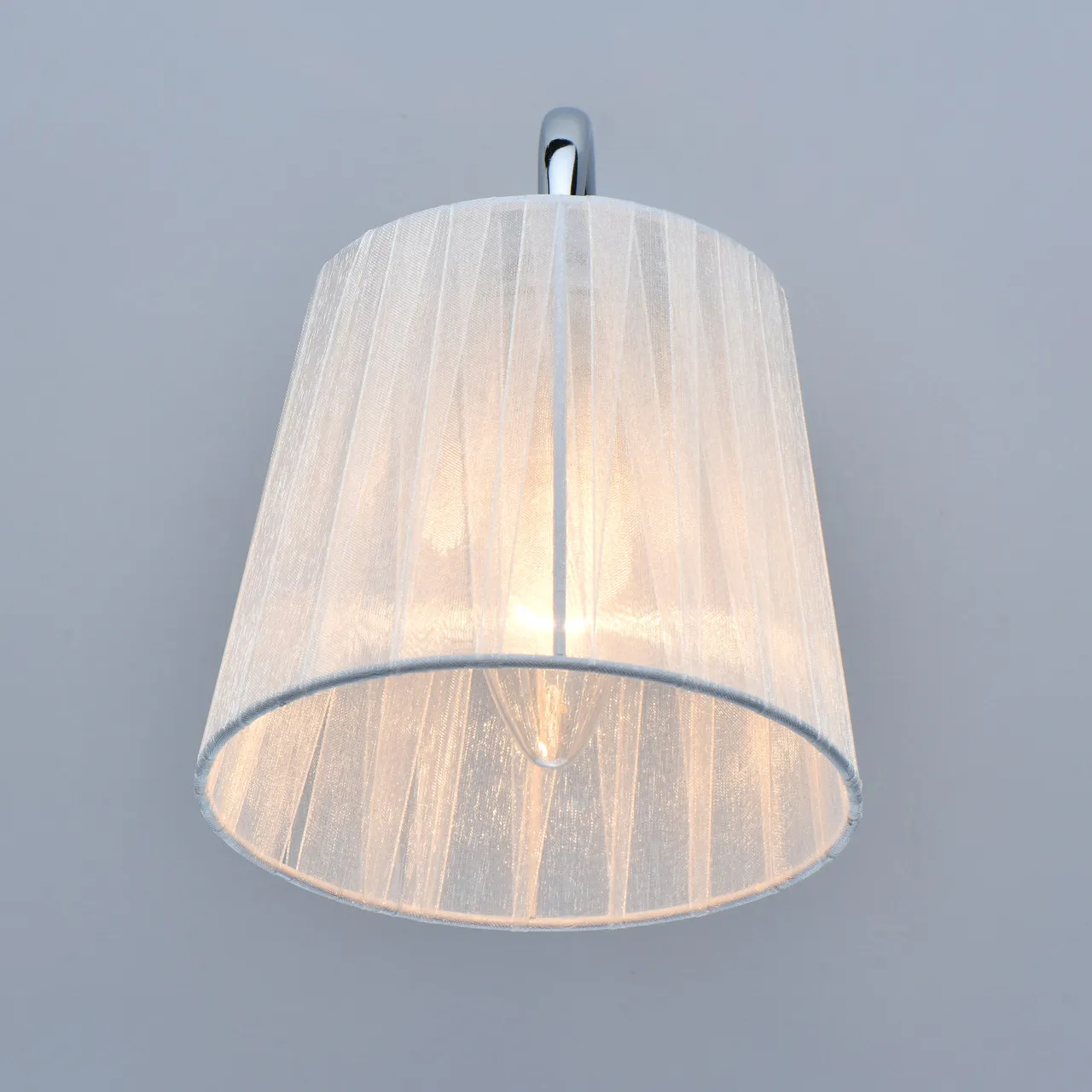 Основание бра выполнено из сплава металла и гальванизировано в цвет хрома. Абажур из прозрачной органзы белого цвета с термостойким акрилом внутри. Абажур отделан кантом сверху и снизу, прошит. Декор бра - металлическая цепочка цвета основания и прозрачный хрусталь в форме шара.