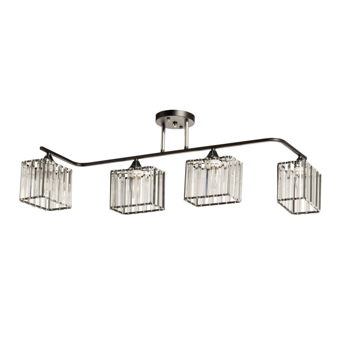 Металлическое основание потолочной люстры окрашено в черный цвет. Отдельные элементы основания гальванизированы в цвет хрома. Плафоны декорированы прозрачным стеклом прямоугольной формы.