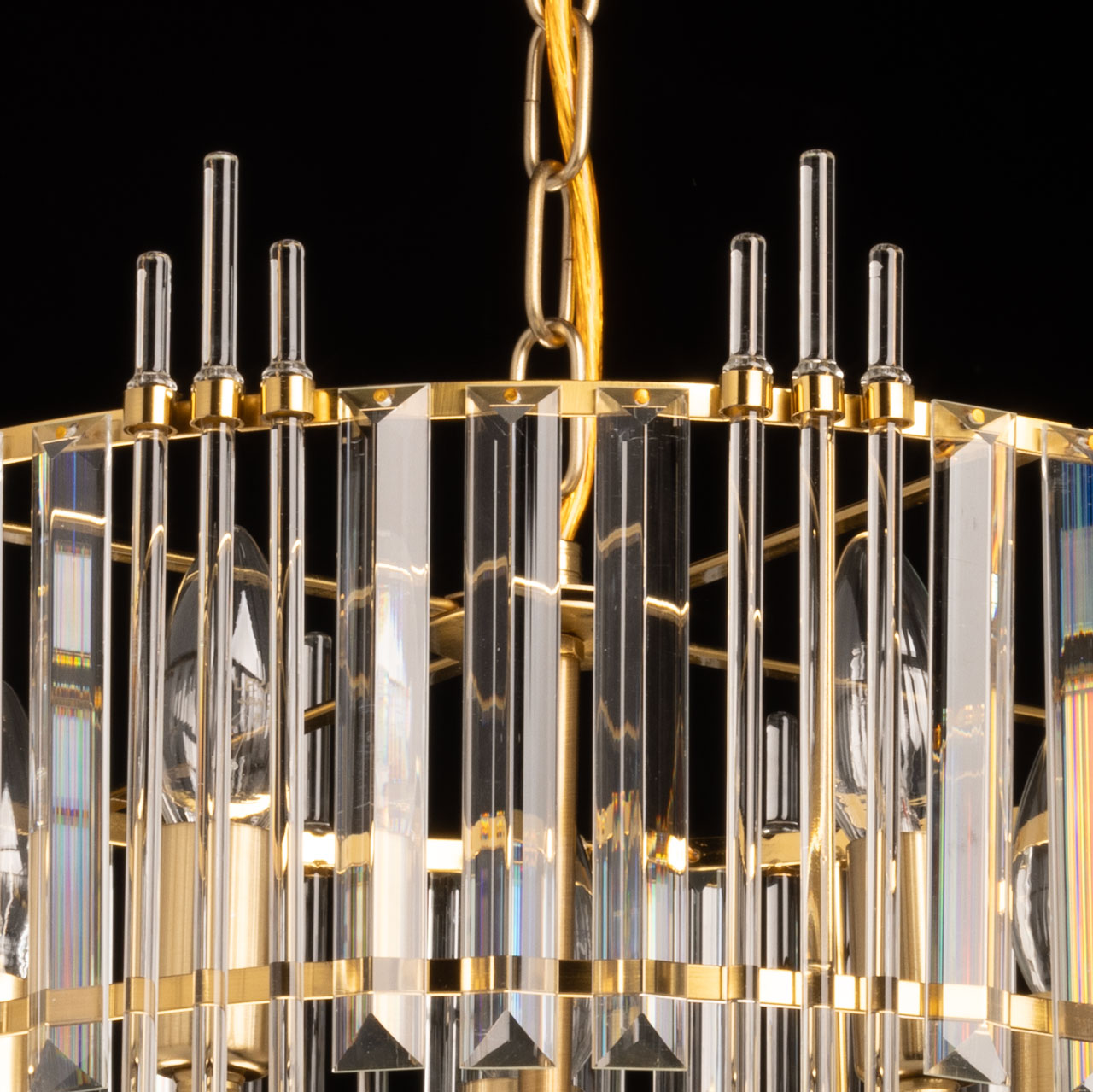 Металлическое основание люстры гальванизировано в цвет латуни. Светильник декорирован прозрачным стеклом вытянутой формы.