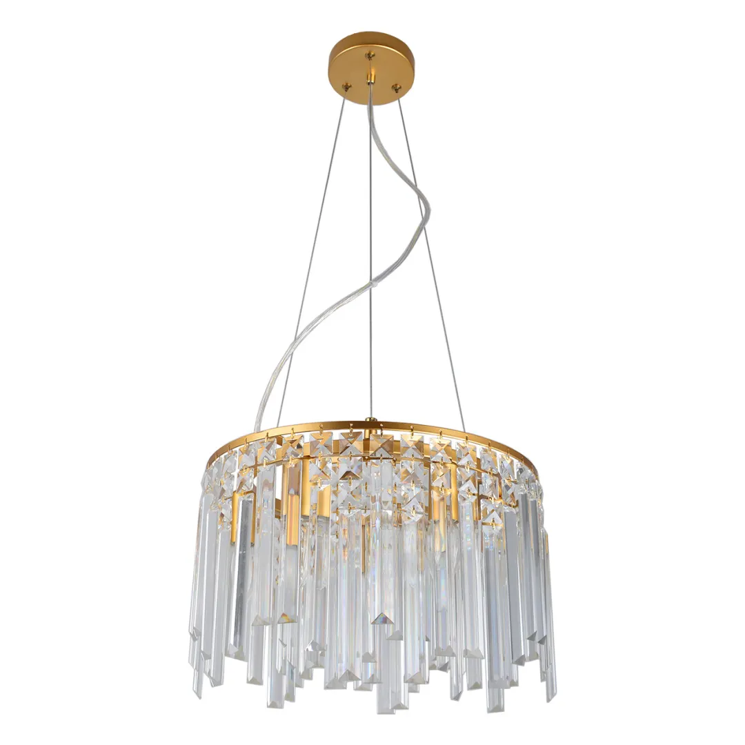 Люстра из коллекции Арман — это элегантное и стильное решение для освещения, которое способно преобразить любое помещение. Она выполнена в изысканном дизайне, где хрустальные подвески, сверкающие на свету, создают неповторимую атмосферу. Эти прозрачные элементы не только добавляют роскоши, но и обеспечивают великолепную игру света, отражаясь и преломляясь, заполняя пространство мягким и теплым сиянием. Металлическое основание люстры имеет круглую форму и покрыто гальванизированным золотым слоем, что придает ей дополнительный блеск и элегантность. Эта люстра, оснащенная шестью лампами, идеально подходит для комнат с высокими потолками, таких как гостиные или залы, оформленные в классическом стиле. Однако благодаря своему лаконичному и универсальному дизайну она также может гармонично вписаться в современные интерьеры, добавляя им нотку изысканности.Хрустальная люстра не только функциональна, но и является настоящим произведением искусства, которое станет центром внимания в любом помещении. Ее можно использовать как в жилых зонах, так и в коммерческих пространствах, таких как рестораны или отели, где важен стиль и атмосфера. Установив такую люстру, вы создадите уют и подчеркнете индивидуальность вашего интерьера, что сделает его по-настоящему уникальным.