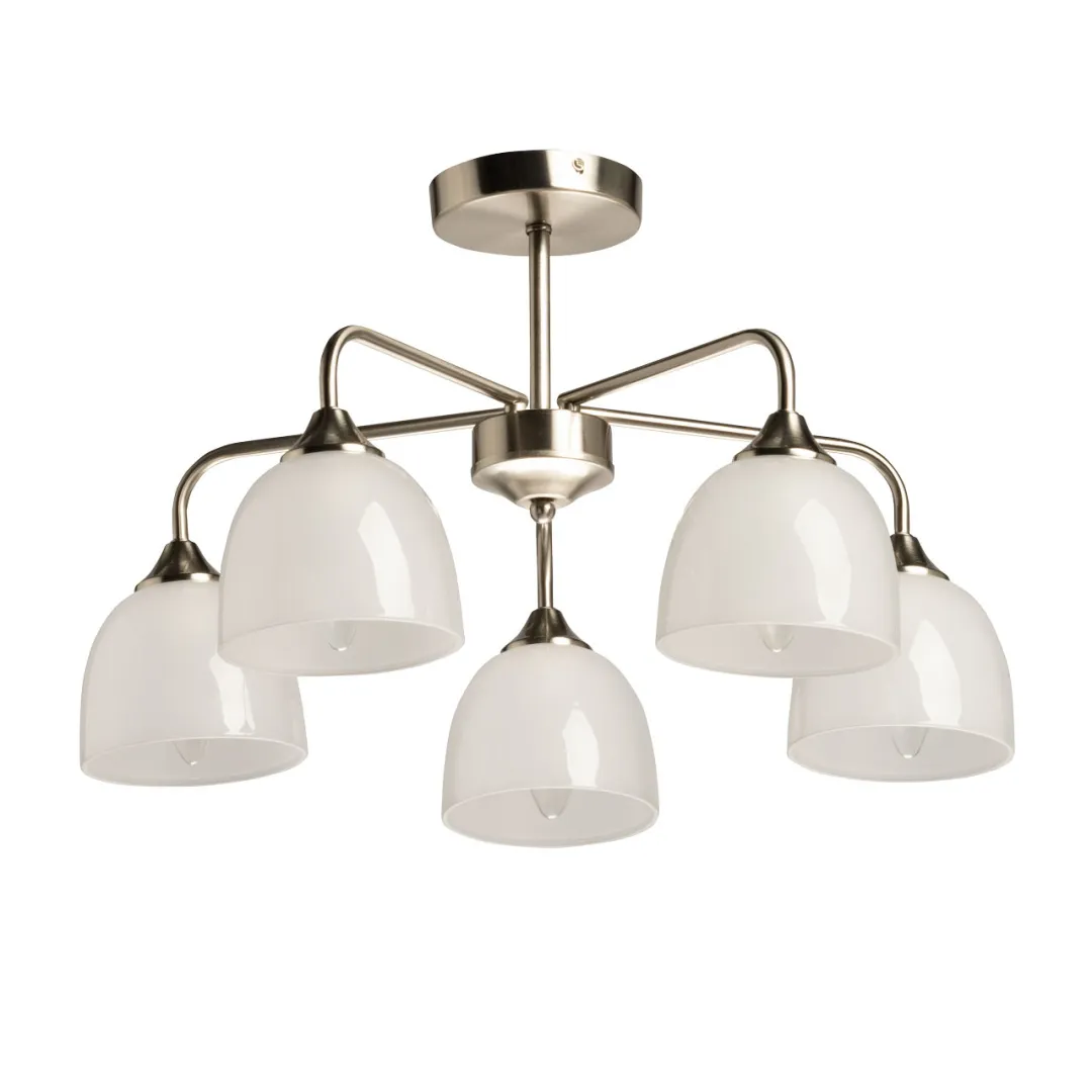 Металлическое основание потолочной люстры гальванизировано в цвет серебра. Стеклянные плафоны отлиты в форму и окрашены в белый цвет изнутри.