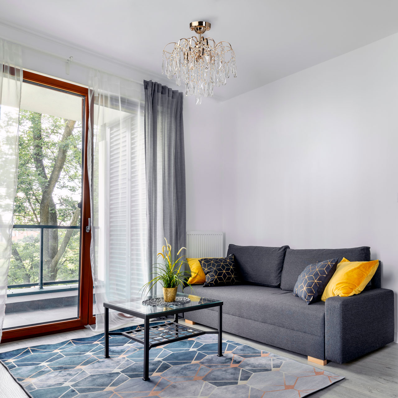 Металлическое основание светильника гальванизировано в цвет золота. Подвесная люстра декорирована прозрачным хрусталем.