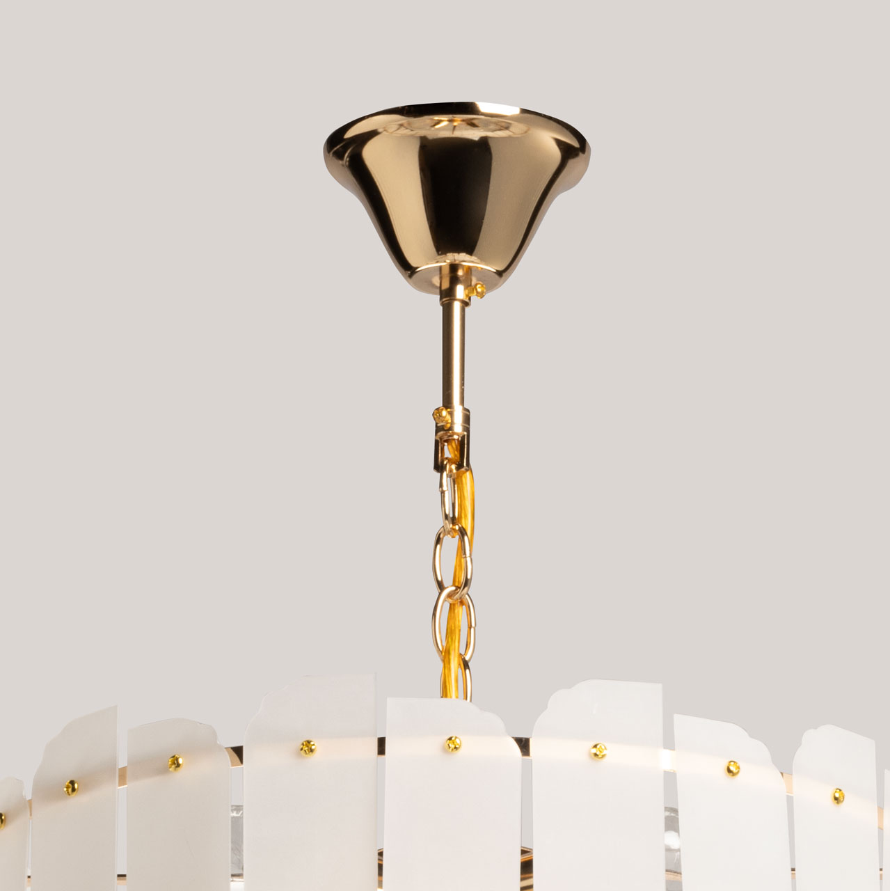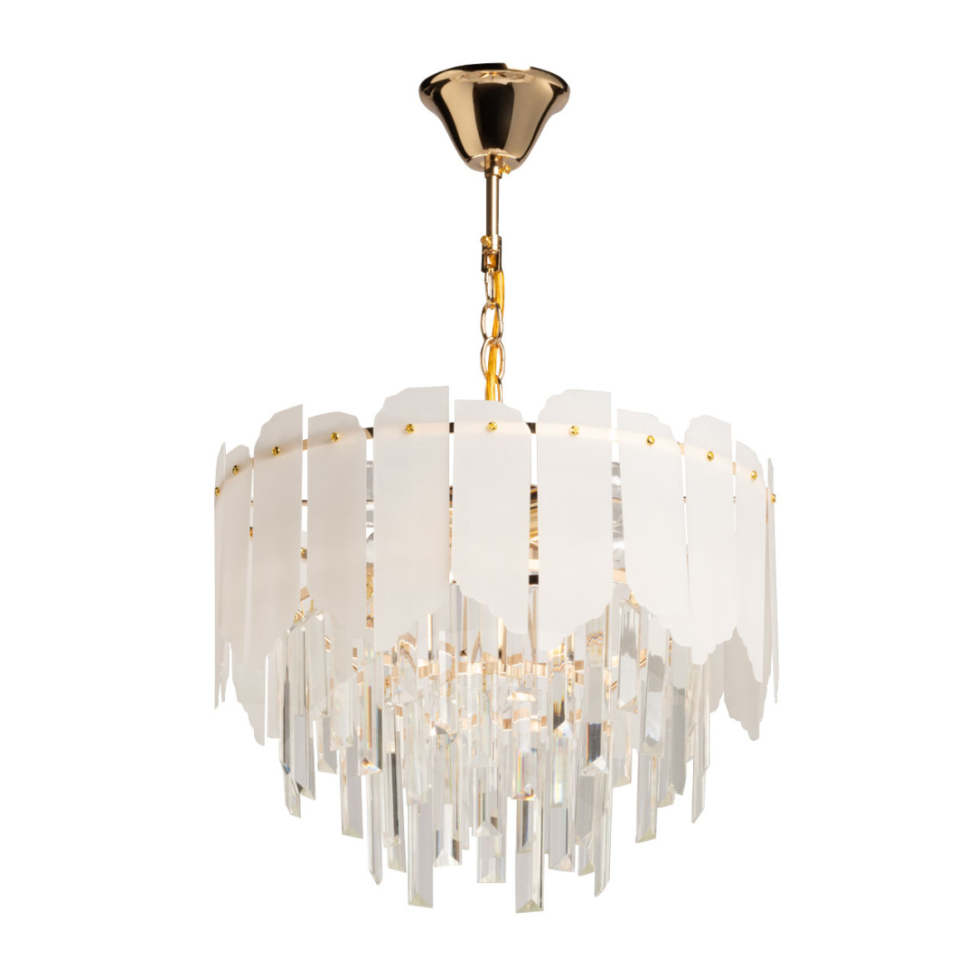 Металлическое основание светильника гальванизировано в цвет золота. Люстра декорирована пластинами из белого акрила неровной формы и прозрачным хрусталем вытянутой формы.