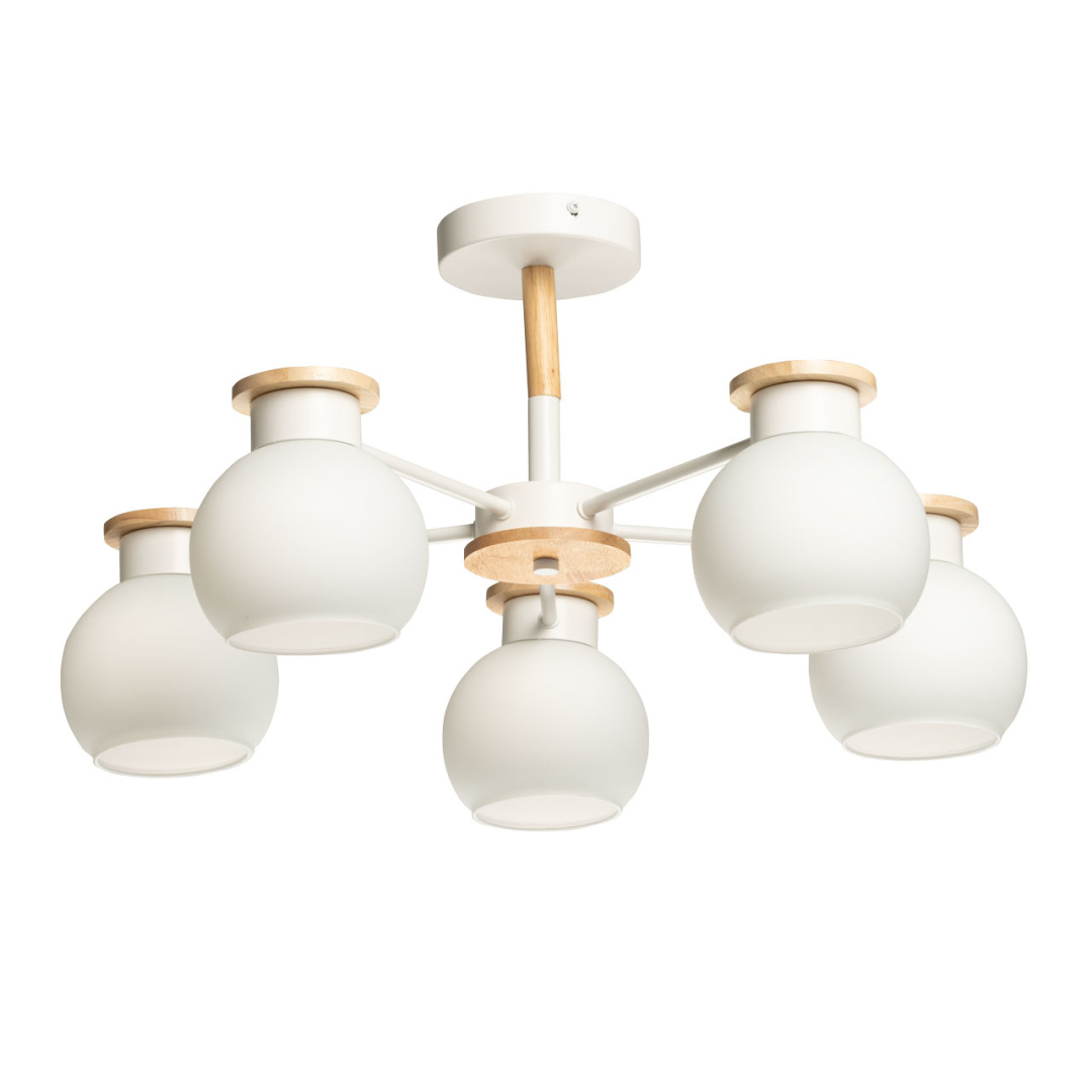 Металлическое основание потолочной люстры окрашено в белый цвет. Стеклянные плафоны отлиты в форму и окрашены в белый цвет с внутренней стороны. Светильник декорирован элементами из натурального светлого дерева.