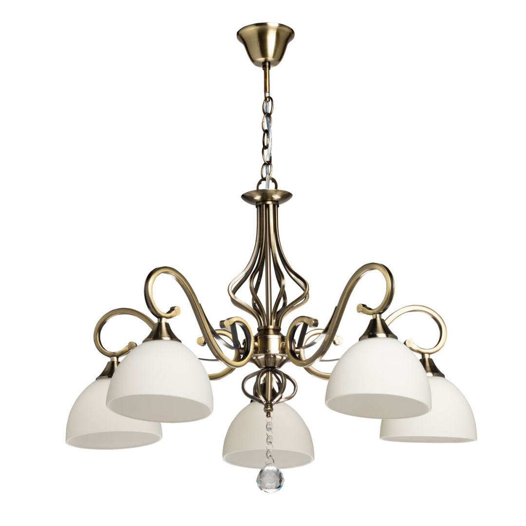 Металлическое основание подвесной люстры гальванизировано в цвет античной бронзы. Стеклянные плафоны отлиты в сложную форму и окрашены в белый цвет изнутри. Люстра декорирована подвеской из хрусталя