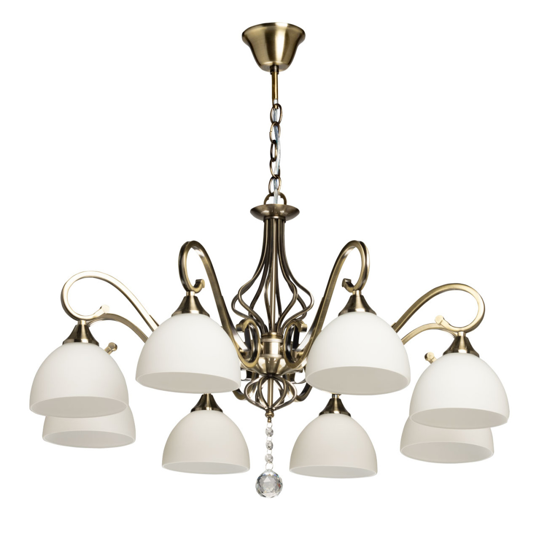 Металлическое основание подвесной люстры гальванизировано в цвет античной бронзы. Стеклянные плафоны отлиты в сложную форму и окрашены в белый цвет изнутри. Люстра декорирована подвеской из хрусталя