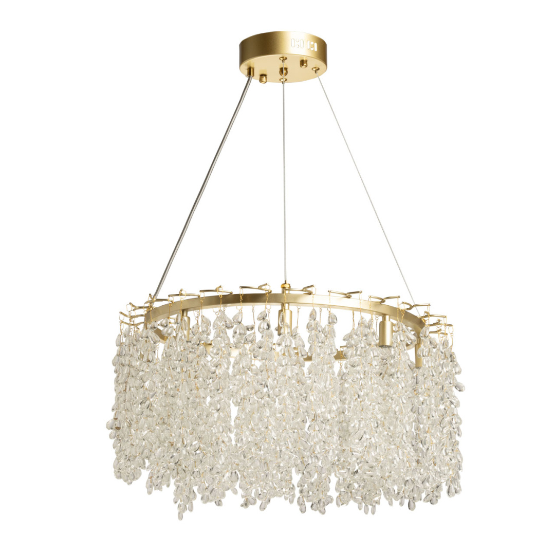Металлическое основание подвесной люстры гальванизировано в цвет золота. Люстра декорирована прозрачным декоративным стеклом.