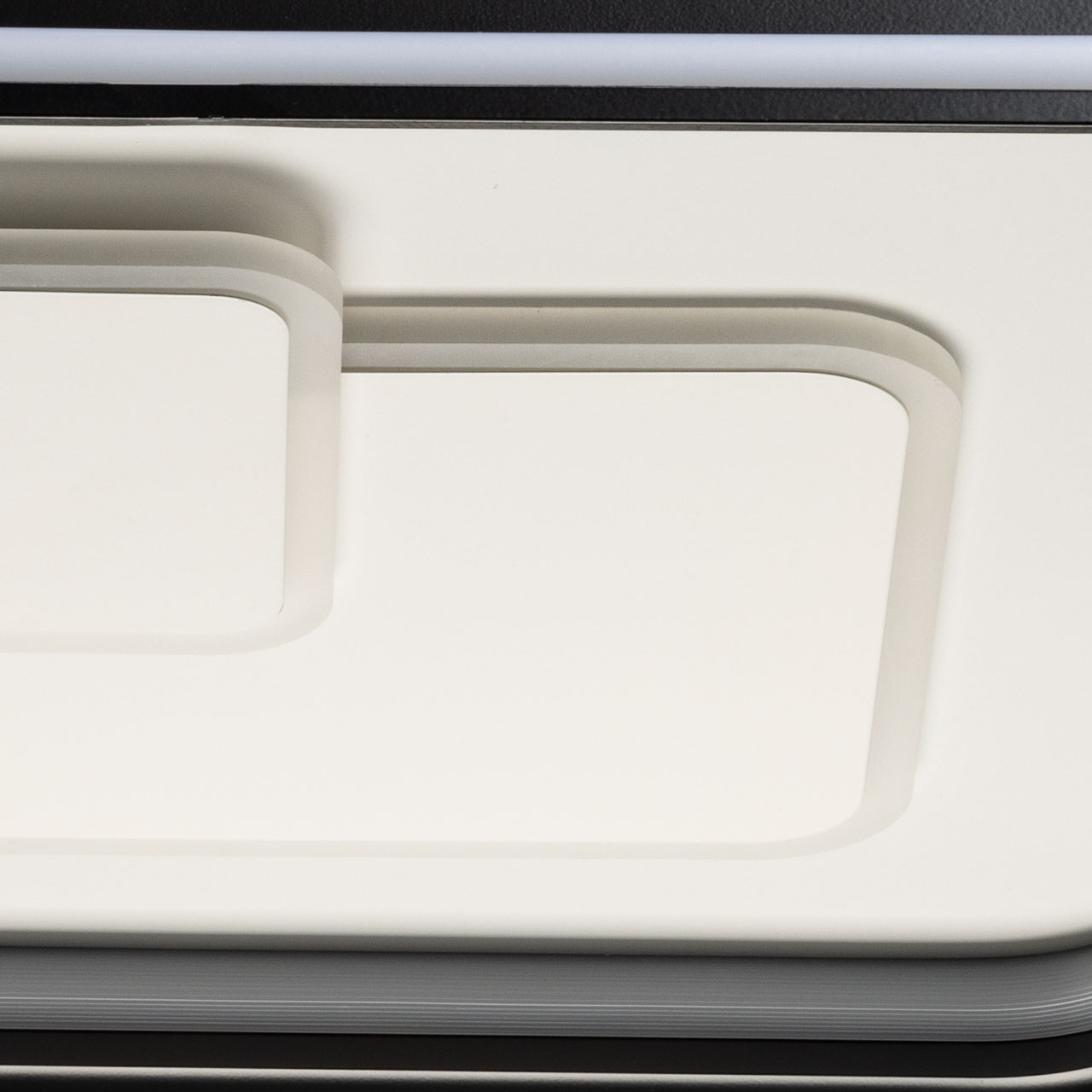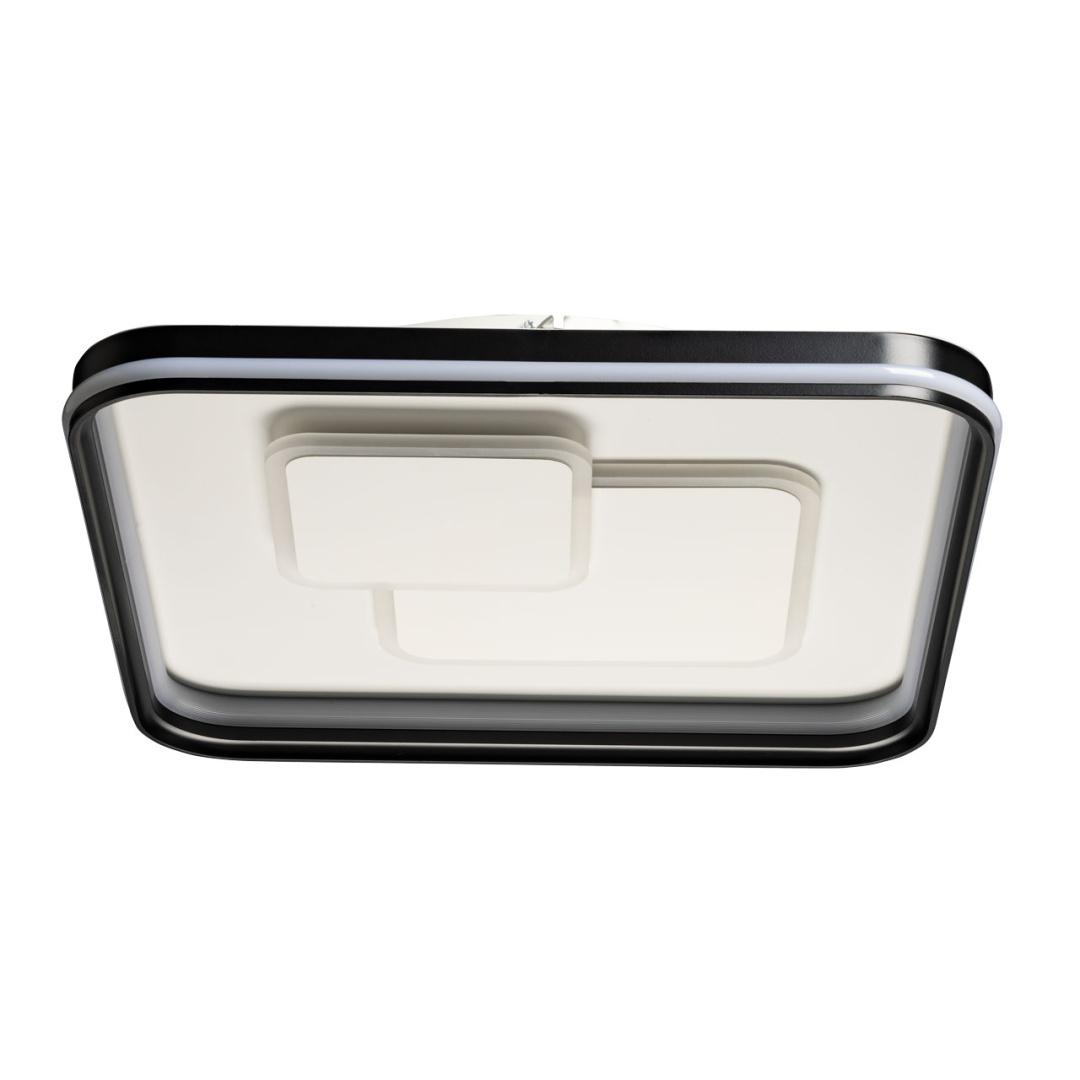 Металлическое основание светильника окрашено в черный и белый цвет. Корпус плафона выполнен из сплава алюминия с цинком и окрашен в белый и черный цвета. Светодиодные источники света закрыты белым матовым акрилом. В комплекте с люстрой идет пульт управления, позволяющий регулировать температуру света и уровень яркости.