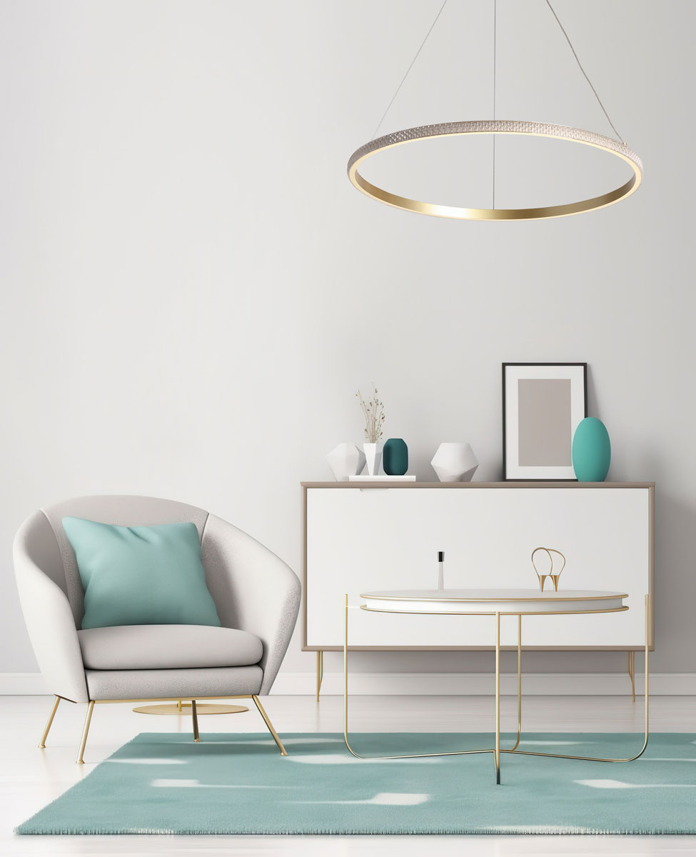 Металлическое основание люстры окрашено в цвет перламутрового золота. Светодиодные источники света закрыты прозрачным акрилом.