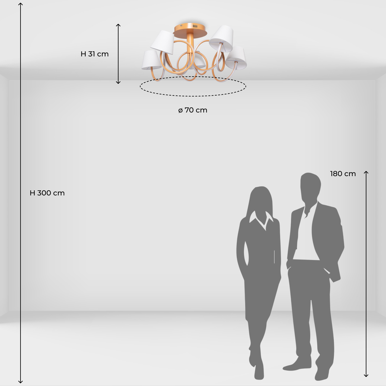 Металлическое основание потолочной люстры окрашено в терракотовый цвет. Корпус плафонов изогнутой формы выполнен из сплава алюминия с цинком и окрашен в цвет основания. Двухслойные абажуры состоят из текстиля белого цвета и термостойкого акрила с внутренней стороны. Абажуры прошиты. Светодиодные источники света закрыты белым силиконом.