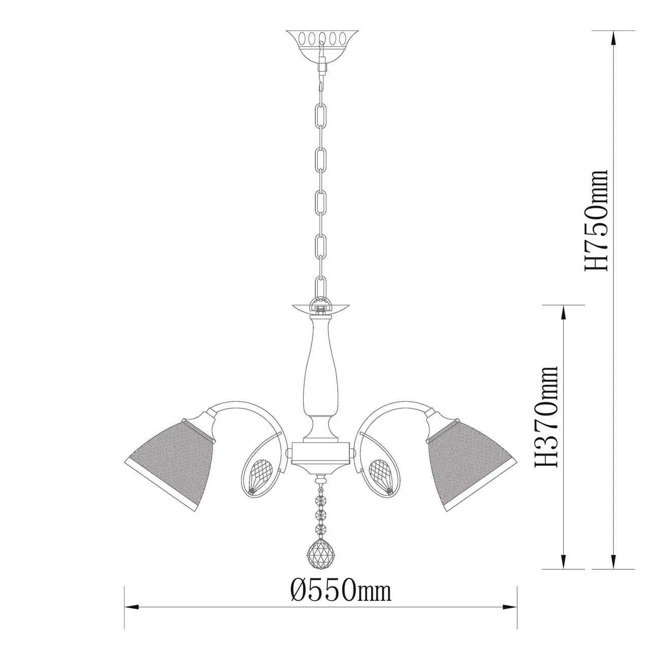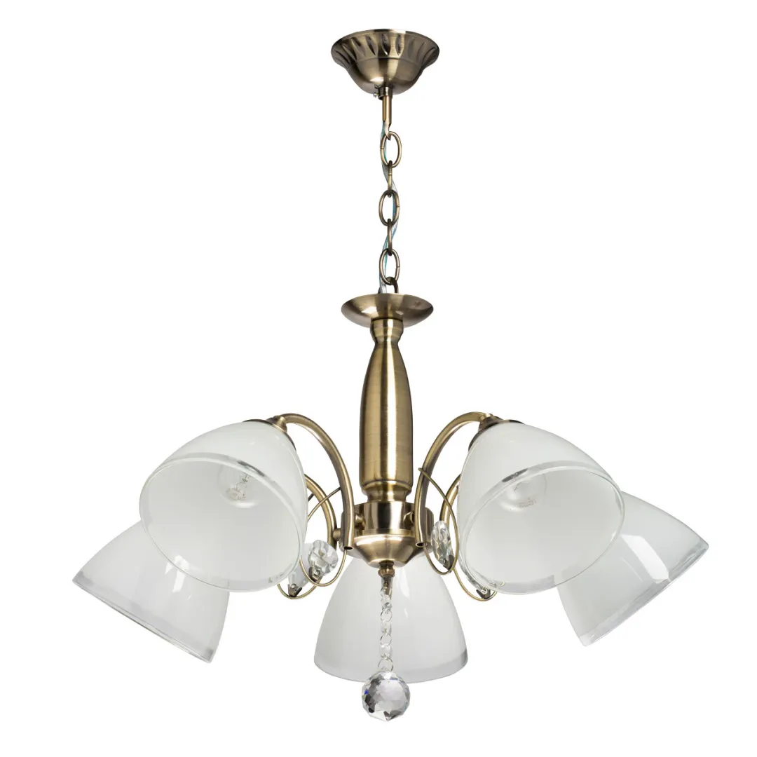 Основание светильника выполнено из металла и гальванизировано в цвет античной бронзы. Стеклянные плафоны выдуваются в форму, матированы. Край плафонов прозрачный. Светильник декорирован хрустальным стеклом миндалевидной формы и хрусталем в форме шара