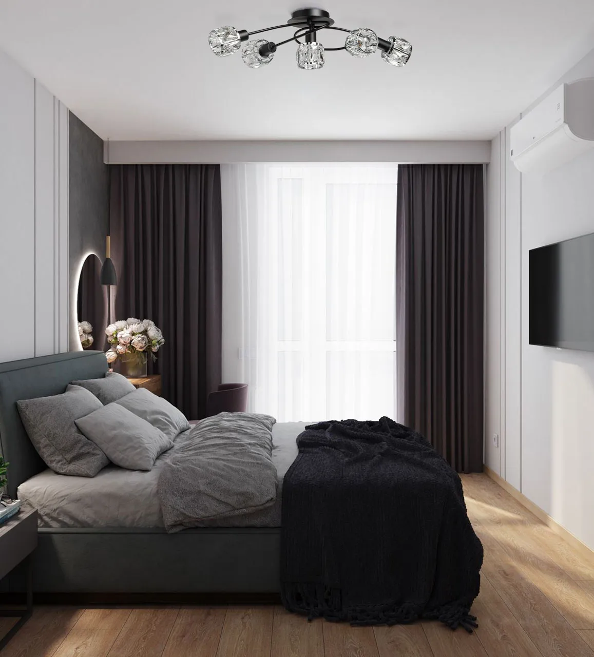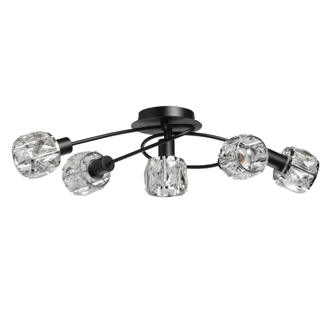 Металлическое основание потолочной люстры окрашено в черный цвет. Плафоны декорированы прозрачным хрусталем прямоугольной формы.