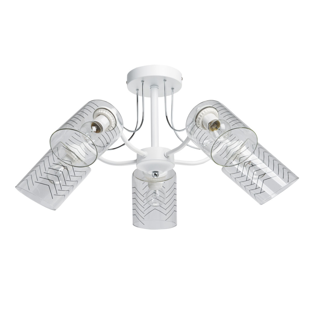 Металлическое основание потолочной люстры окрашено в белый цвет. Отдельные элементы основания гальванизированы в цвет хрома. На прозрачные стеклянные плафоны вытянутой формы нанесен геометричный орнамент.