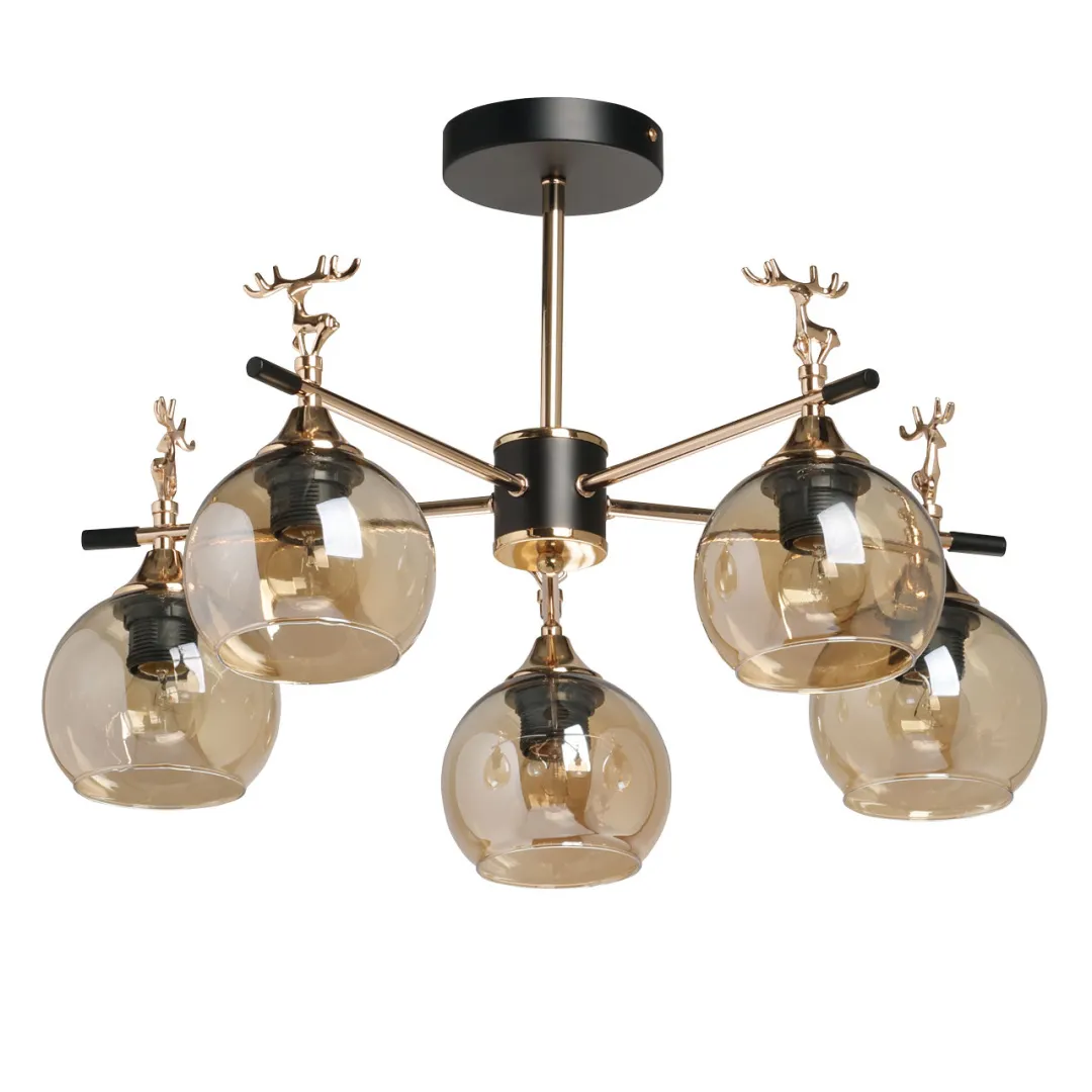 Металлическое основание потолочной люстры окрашено в черный цвет. Отдельные элементы основания гальванизированы в цвет золота. Выдувные вручную стеклянные плафоны гальванизированы в цвет шампань. Люстра декорирована оригинальными фигурками оленей, выполненными из сплава алюминия с цинком по технологии художественного литья и гальванизированными в цвет золота.