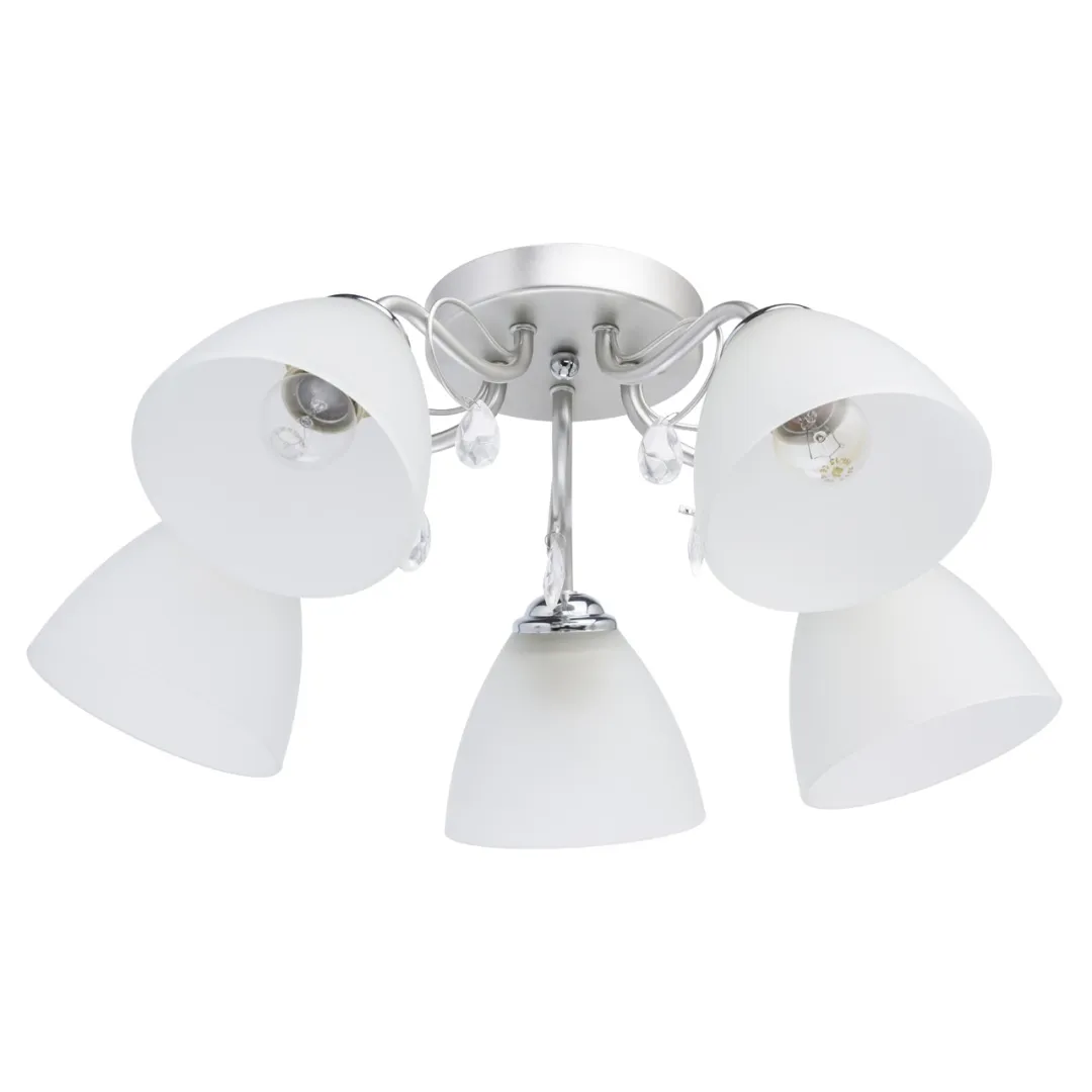 Основание светильника выполнено из металла и окрашено в цвет перламутрового серебра. Держатели плафонов гальванизированы в цвет хрома. Плафоны из матированного стекла. Светильник декорирован подвесками из стекла.