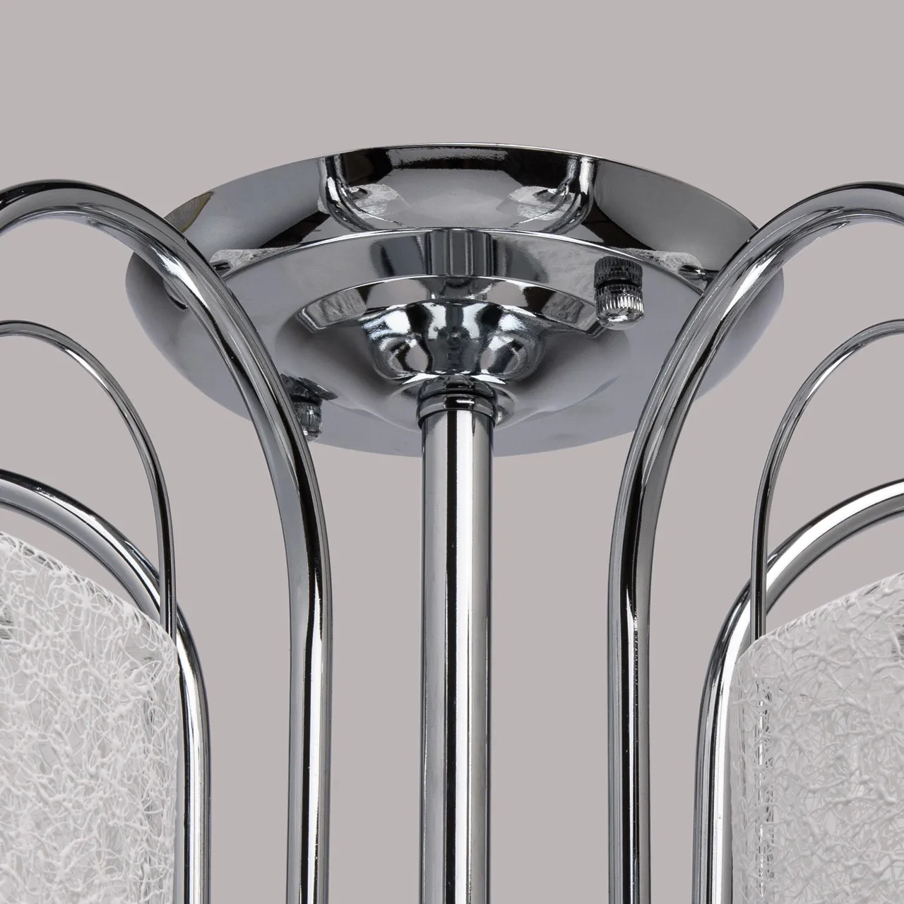 Основание: сплав металла, гальванизировано в цвет хрома. Потолочная чаша, декоративные розетки, корпус: обработка на токарном станке.Рожки, декоративные элементы: прокат на роликовом станке.Плафоны: прозрачное стекло, на стекло нанесен вручную хаотичный рисунок белой краской.