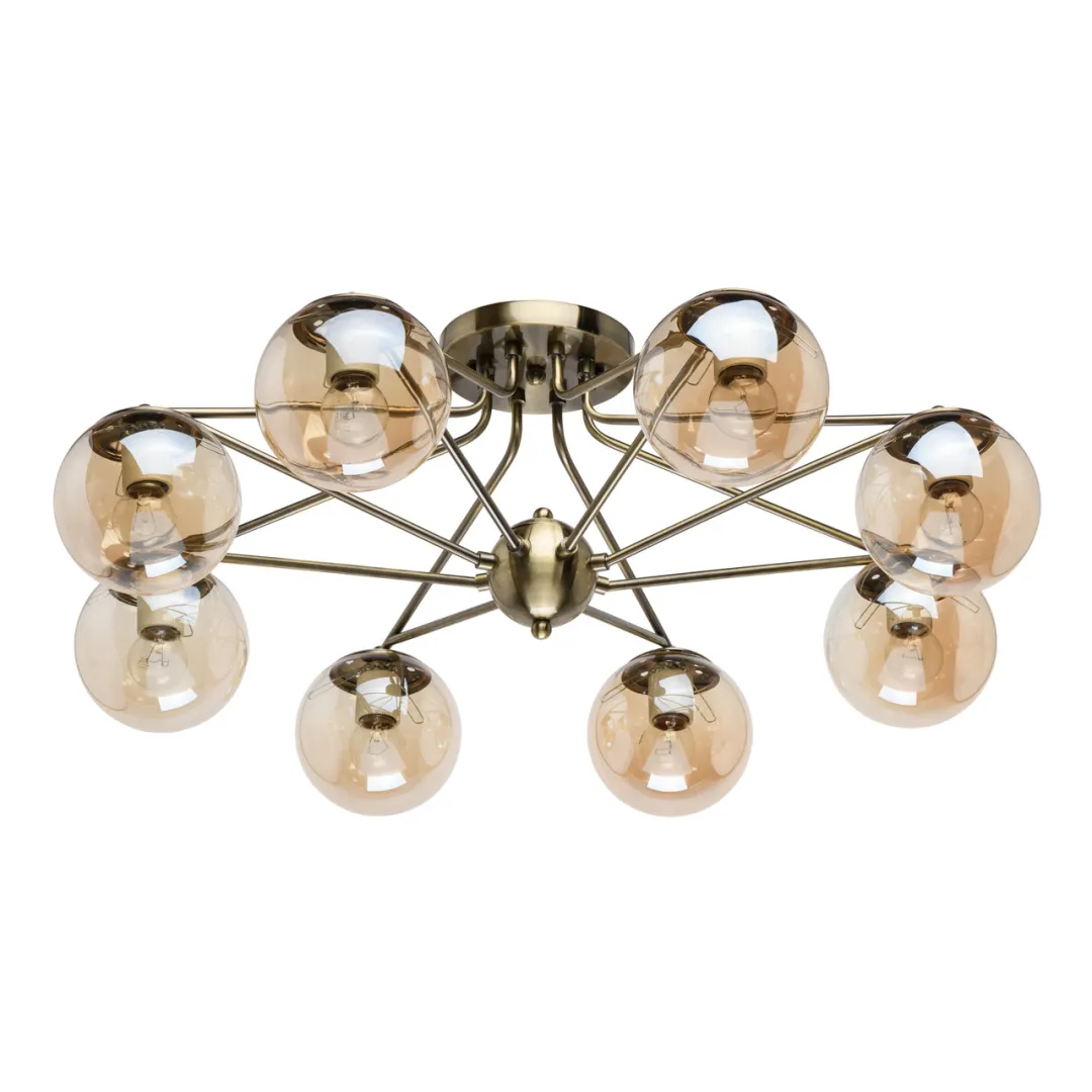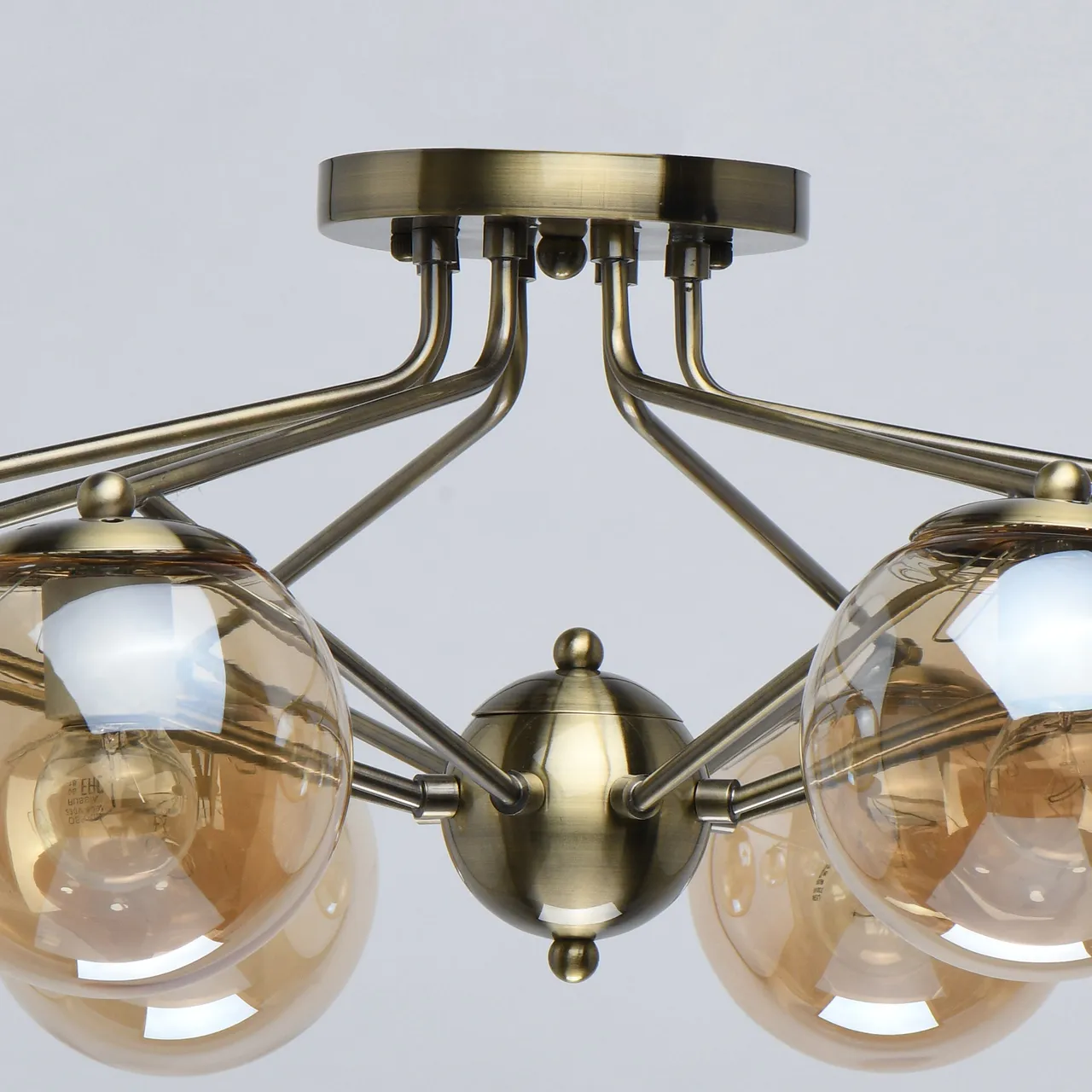 Основание светильника выполнено из металла и гальванизировано в цвет античной бронзы. Светильник декорирован стеклянными плафонами, гальванизированными в цвет топаз.