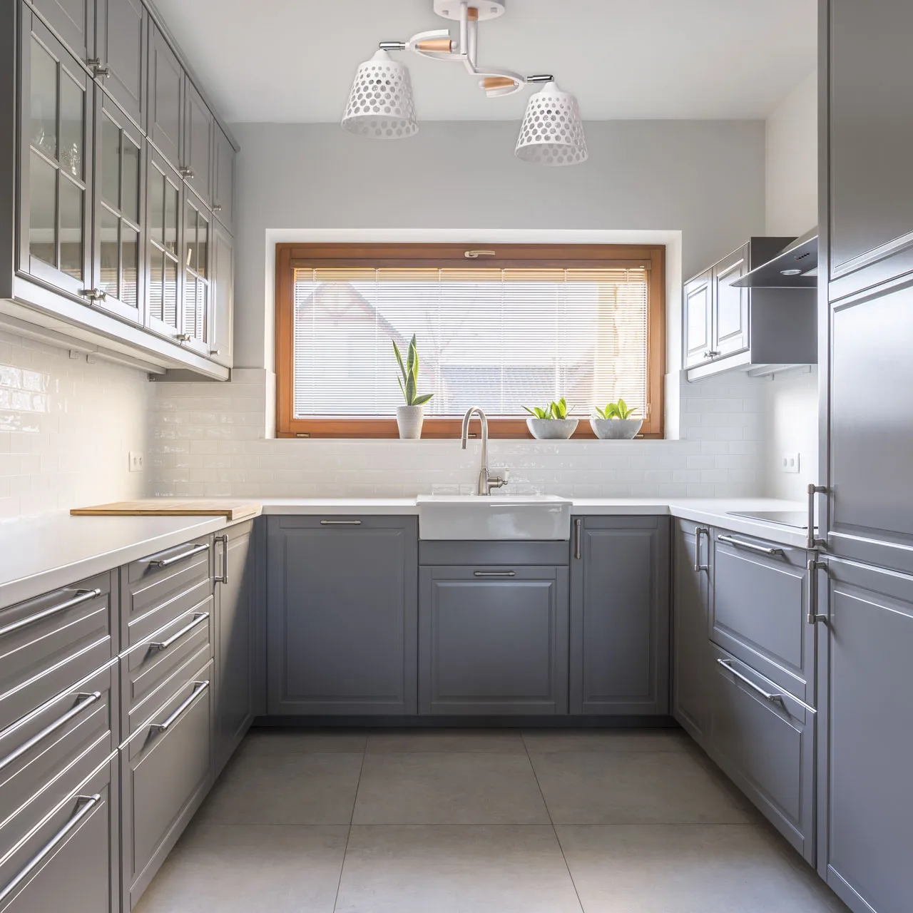 Металлическое основание потолочной люстры окрашено в белый цвет. Отдельные элементы основания гальванизированы в цвет хрома. Металлические плафоны перфорированы и окрашены в цвет основания. Светильник декорирован элементами из светлого натурального дерева.