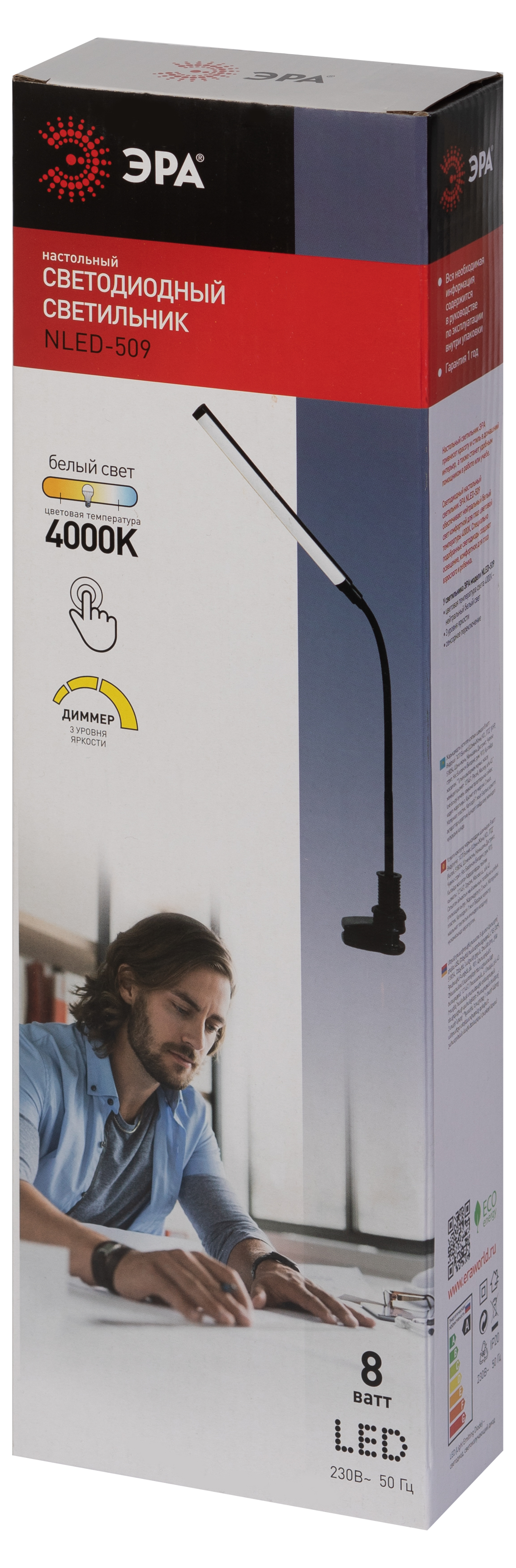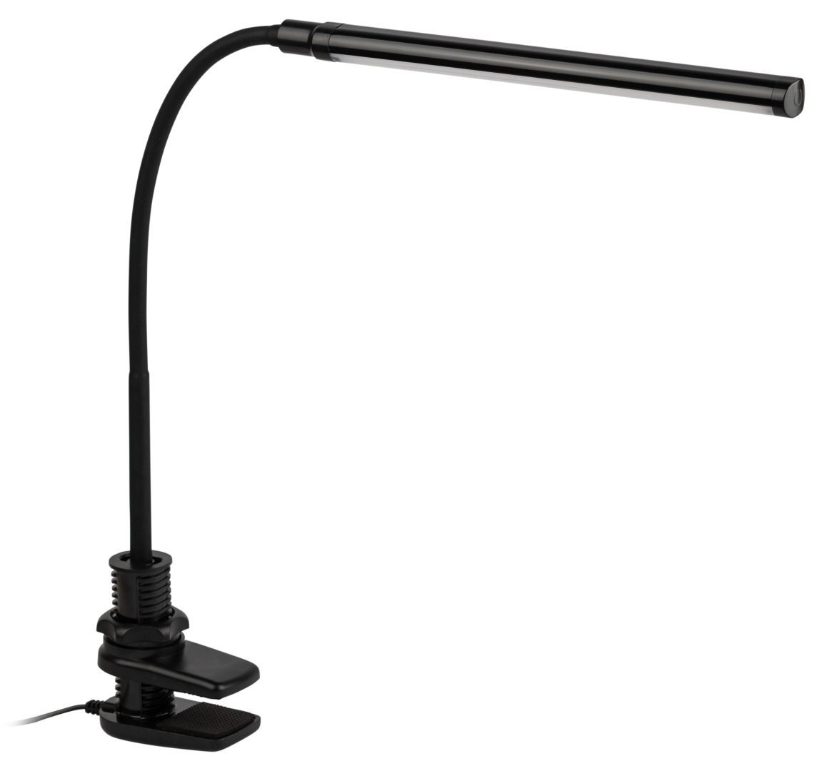 Настольный светильник со светодиодами (LED) в качестве источников света, 8 Вт. Модель на струбцине с сенсорным переключателем на плафоне. Плавная регулировки яркости. Высота плафона регулируется гибкой стойкой. Нейтральный белый свет - цветовая температура 4000К.