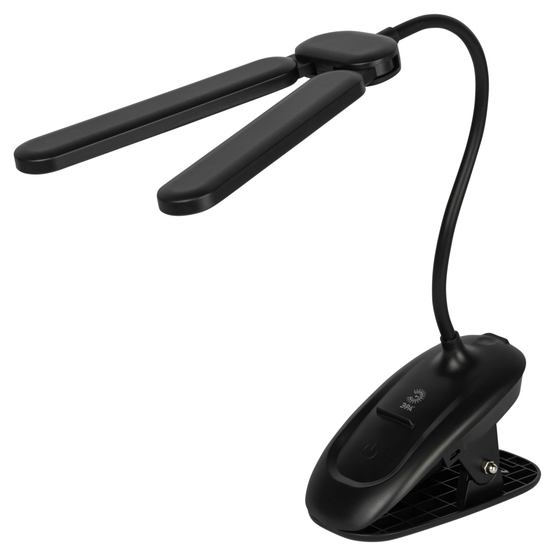 Настольный светильник ЭРА NLED-512-6W-BK со светодиодами (LED) в качестве источников света, с сенсорным управлением, возможностью выбора цветовой температуры и плавным диммером для регулировки яркости. Модель на прищепке, которая обеспечивает надежную фиксацию на выступающих поверхностях. Встроенный литиевый аккумулятор для автономной работы. Подзарядка от USB. USB-кабель в комплекте. Гибкая стойка и двойной плафон (из двух отдельных частей) позволяют выбирать наиболее комфортное направление света.