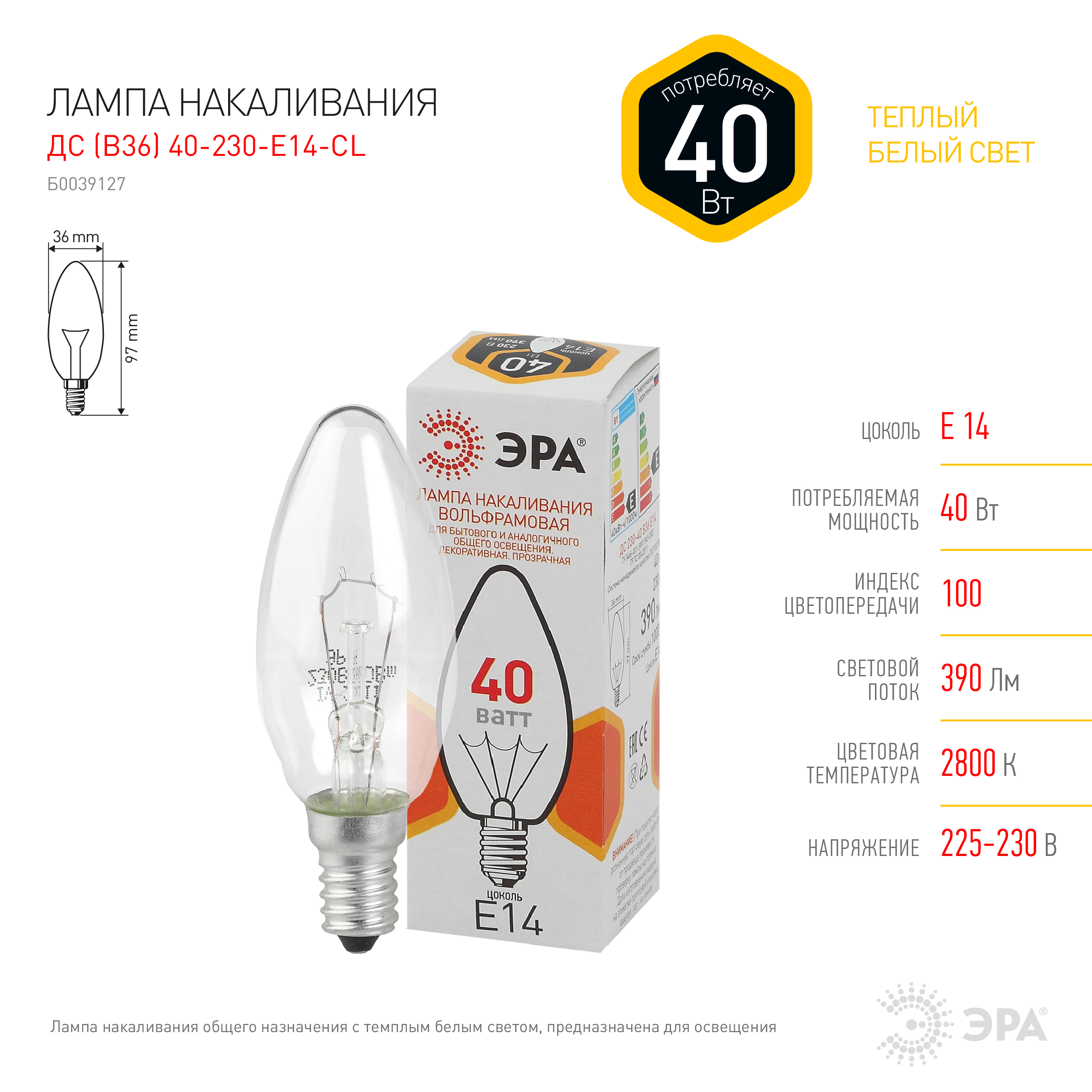 Лампа накаливания эра дс 230-40-1 б0039127
