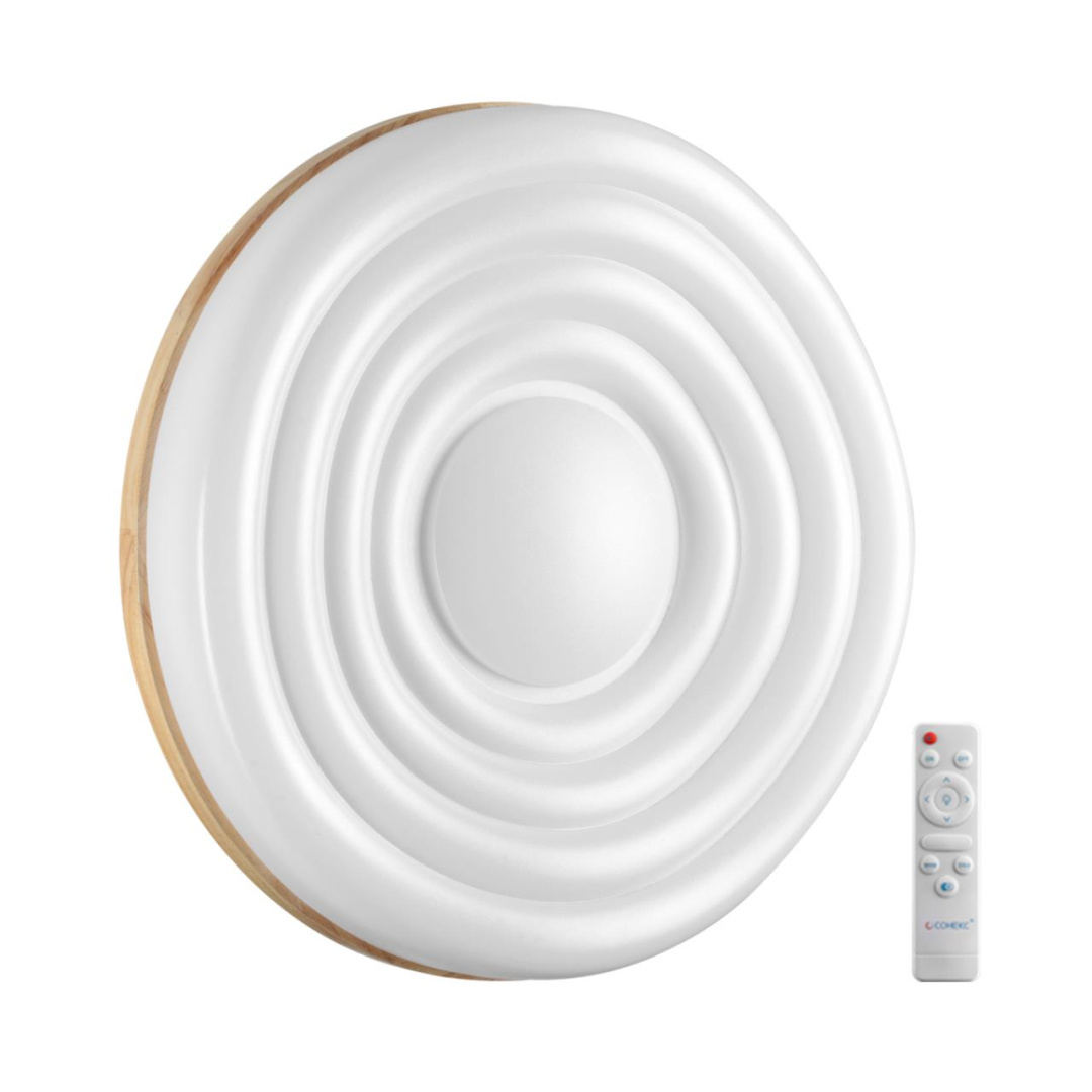 Светильник 7674/EL линии FASS WOOD состоит из металлического основания (базы) и пластикового рассеивателя. Материал рассеивателя - высококачественный пластик марки PMMA 2.0 белого цвета с глянцевой поверхностью и рельефной структурой. Пластик обеспечивает светильнику равномерное рассеивание и хорошее светопропускание. Форма плафона: круглая, декорирована ободом из натурального дерева. Степень защиты IP43 позволяет использовать светильник в определенных зонах влажных помещений. В комплект входит заменяемый LED модуль с линзами, мощностью 70Вт, которая соответствует лампе накаливания 610Вт. А также пульт ДУ (с креплением на стену), с помощью которого осуществляется плавное изменение цветовой температуры 3000-6000К, изменение яркости, переход в режим переключения теплого/белого/холодного/ночного света. Светильник имеет функцию "память".