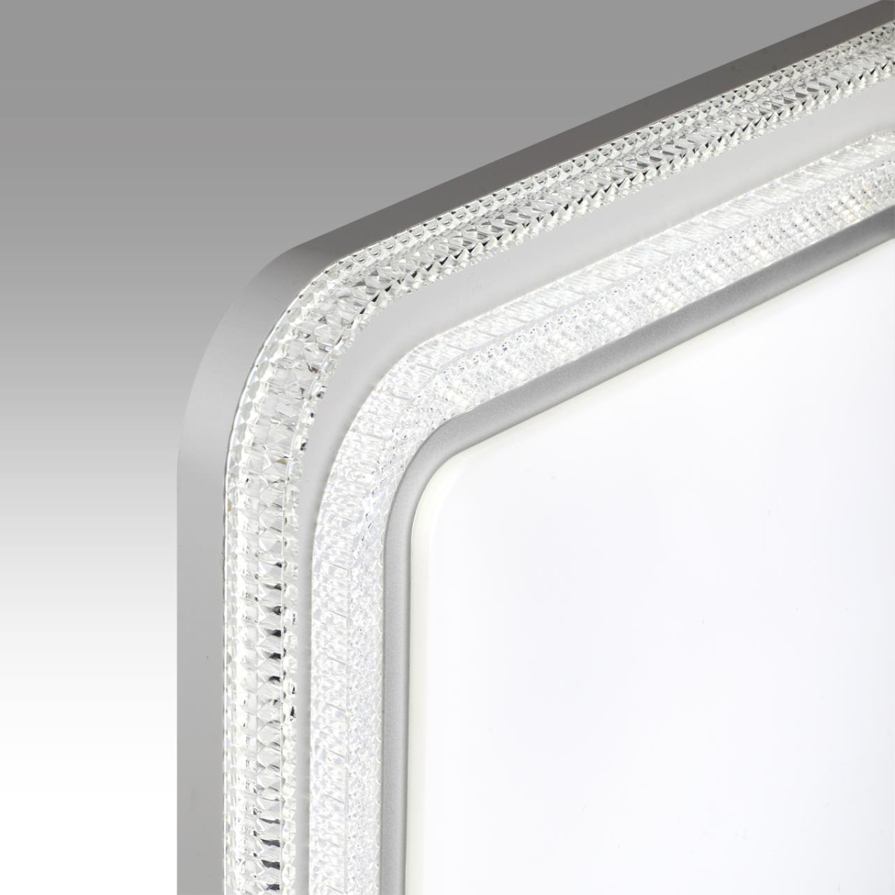 Светильник 7685/EL линии SUZY SILVER состоит из металлического основания (базы) и пластикового рассеивателя. Материал рассеивателя - высококачественный пластик марки PMMA 2.0 белого цвета с матовой поверхностью, без текстуры. Пластик обеспечивает светильнику равномерное рассеивание и хорошее светопропускание. Форма плафона: квадратная, декорирована двойным прозрачным ободом "под хрусталь" из пластика прозрачного цвета. Обод украшен пластиковым кантом, цвет серебро. Степень защиты IP43 позволяет использовать светильник в определенных зонах влажных помещений. В комплект входит заменяемый LED модуль с линзами, мощностью 70Вт, которая соответствует лампе накаливания 610Вт. А также пульт ДУ (с креплением на стену), с помощью которого осуществляется плавное изменение цветовой температуры 3000-6000К, изменение яркости, переход в режим переключения теплого/белого/холодного/ночного света. Светильник имеет функцию "память".
