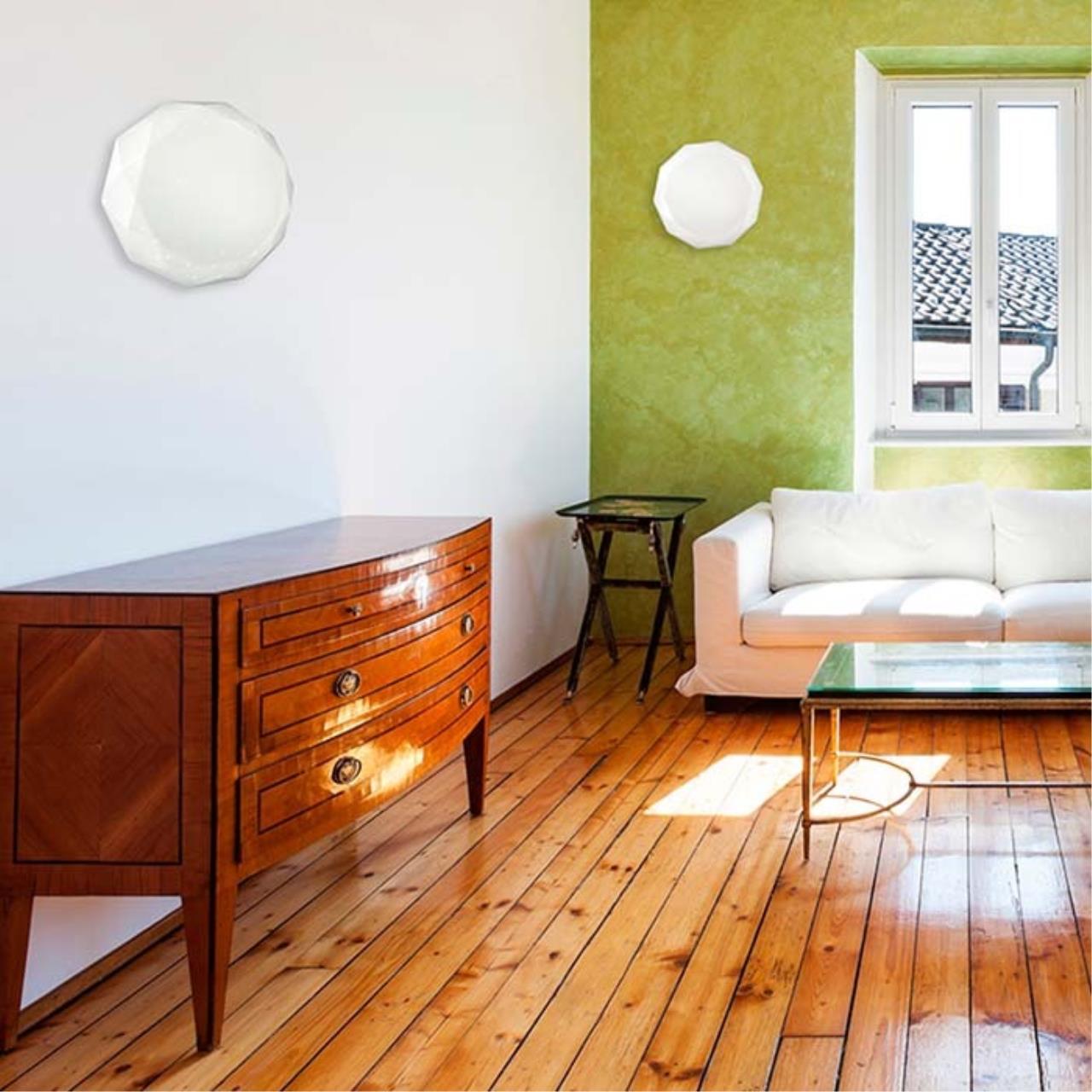 Светильник 2012/EL линии TORA состоит из металлического основания (базы) и пластикового рассеивателя. Материал рассеивателя - высококачественный акрил белого цвета с глянцевой поверхностью, обеспечивающий светильнику равномерное рассеивание и хорошее светопропускание. Форма плафона: круглая, декорирована рельефным орнаментом по краям и рисунком в виде прозрачных точек, которые придают включенному светильнику красивый эффект "звездного мерцания" и переливания. Степень защиты IP43 позволяет использовать светильник в определенных зонах влажных помещений. В комплект входит заменяемый LED модуль с линзами, мощностью 72Вт, которая соответствует лампе накаливания 730Вт. А также пульт ДУ, с помощью которого осуществляется плавное изменение цветовой температуры 3000-6300К, изменение яркости, переход в режим переключения теплого/белого/холодного/ночного света. Светильник имеет функцию "память".