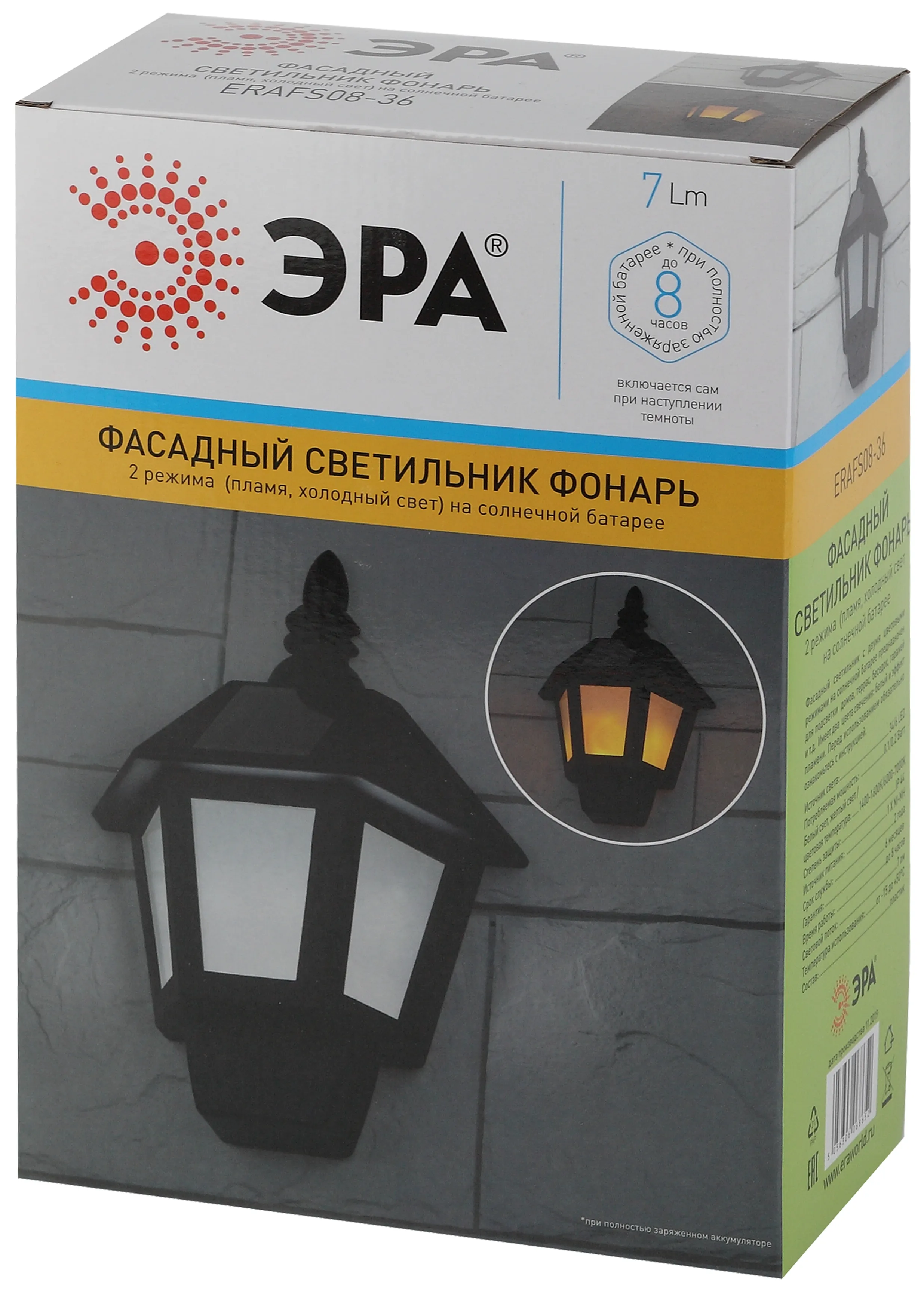 Светильник настенный фасадный на солнечной батарее ERAFS08-36 станет чудесным дополнением фасада вашего дома, террасы, беседки. Беспроводной LED светильник имеет два режима освещения: статичное белое и динамичный эффект пламени. Переключение происходит перемещением кнопки в стороны, а выключение переводом клавиши в середину ячейки.