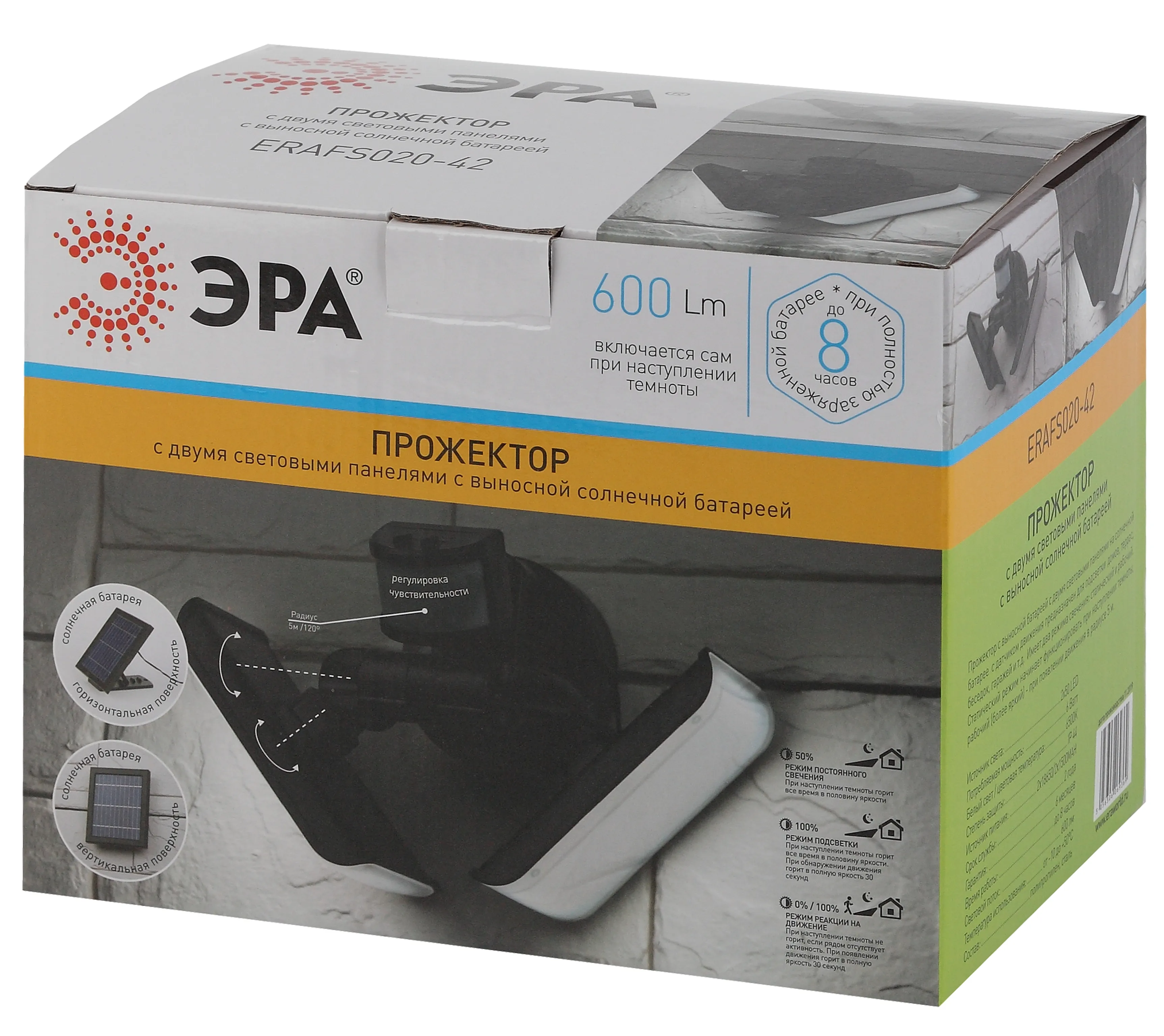 Влагозащищённый светодиодный прожектор ЭРА ERAFS020-42 на улицу с двумя световыми панелями и выносной солнечной панелью, которая может монтироваться отдельно от источника света. 100 ярких качественных светодиодов! Световые потоки направлены в противоположные стороны, позволяя освещать большую площадь. Угол наклона каждой панели можно регулировать. Между LED-панелями расположен датчик движения.
