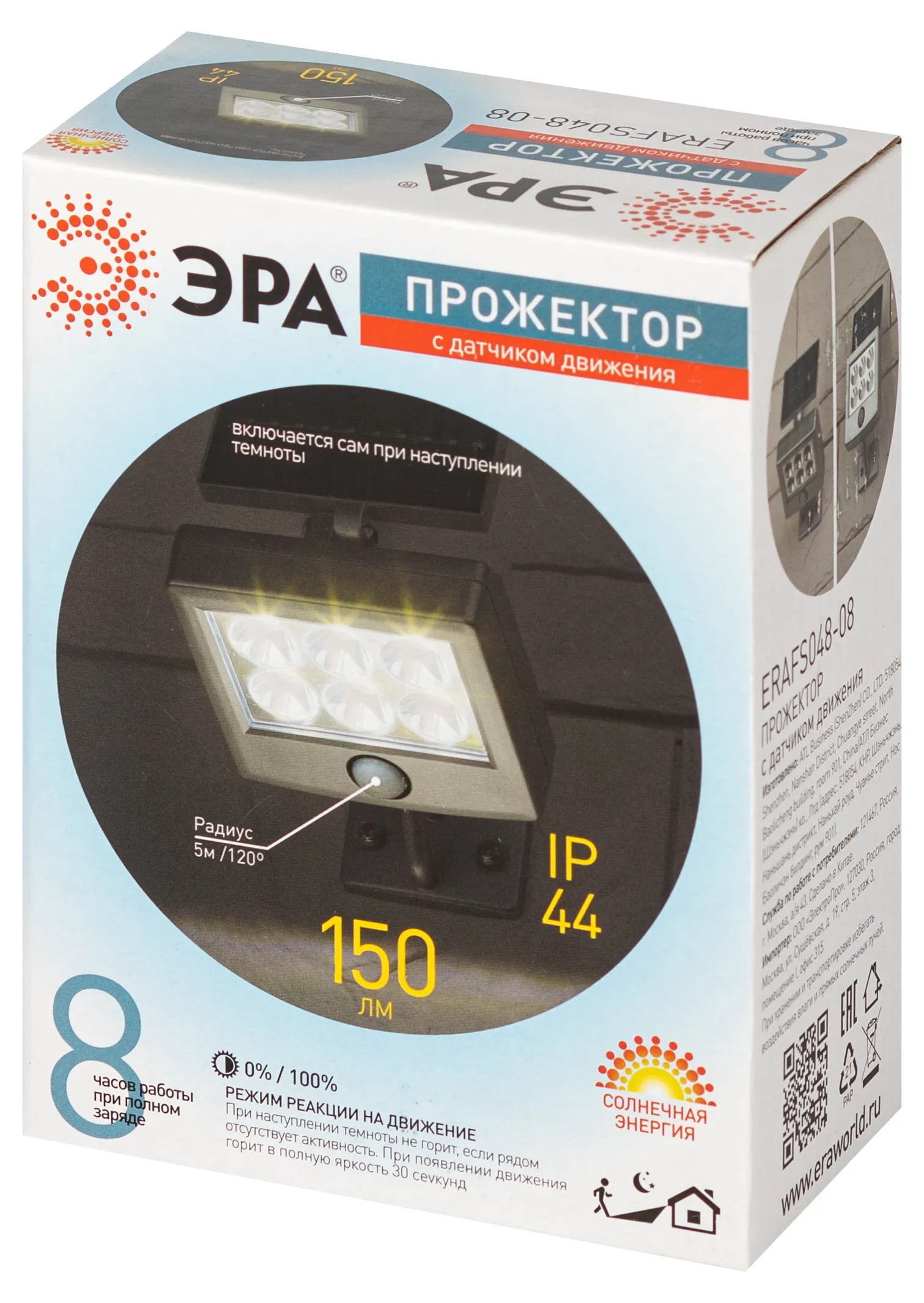Светодиодный прожектор ЭРА ERAFS048-08 с солнечной панелью и встроенным в корпус датчиком движения. Быстро монтируется в любом месте придомовой территории или загородного участка. Преимущество такого типа освещения — отсутствие привязки к электросети. В течение светового дня солнечная батарея накапливает энергию. С наступлением темноты источник света начинает свою работу.